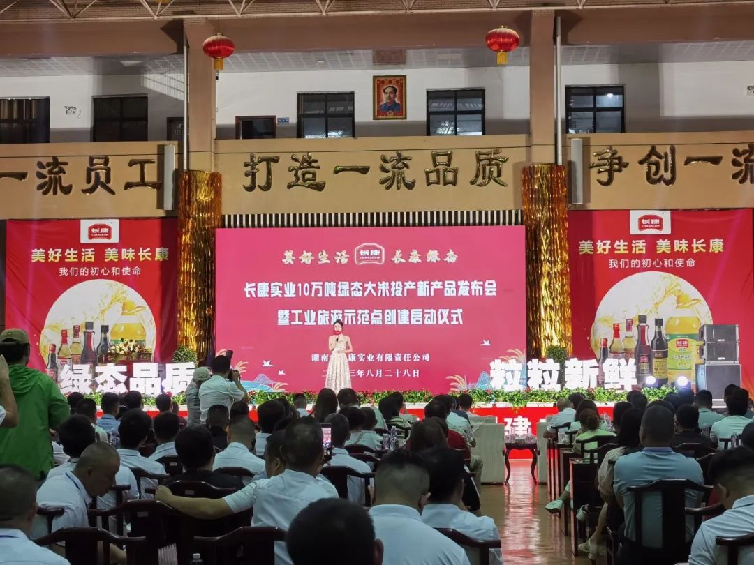 2023年8月28日,长康实业10万吨绿态大米加工投产新产品发布会暨工业旅游示范点创建的启动仪式在湘阴举办。湘阴县各级领导、部门单位、战略合作单位及来自全国优秀的200多名客商代表们齐聚一堂,共同见证长康新品——绿态大米首次发布。