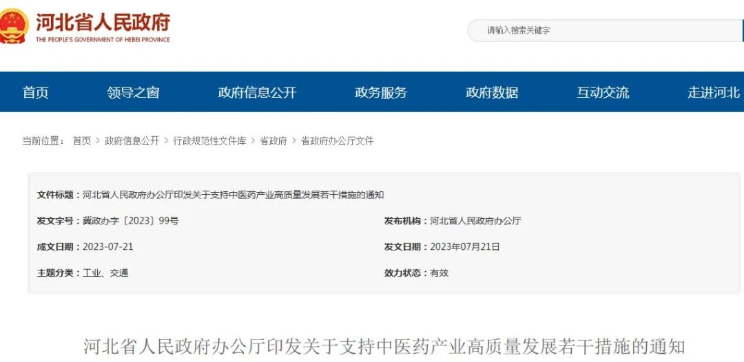 河北省人民政府办公厅印发关于支持中医药产业高质量发展若干措施的通知