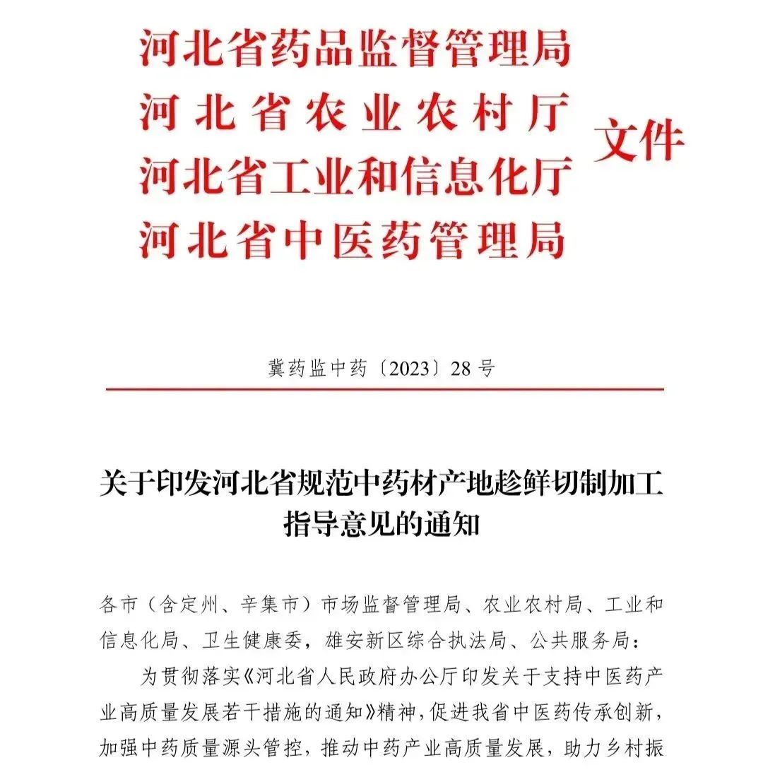 为贯彻落实《河北省人民政府办公厅印发关于支持中医药产业高质量发展若干措施的通知》精神,促进河北省中医药传承创新,推动中药产业高质量发展,日前,河北省药品监督管理局会同省农业农村厅、省工业和信息化厅、省中医药管理局等部门,结合我省实际,联合制定了《河北省规范中药材产地趁鲜切制加工指导意见》(以下简称《指导意见》)。