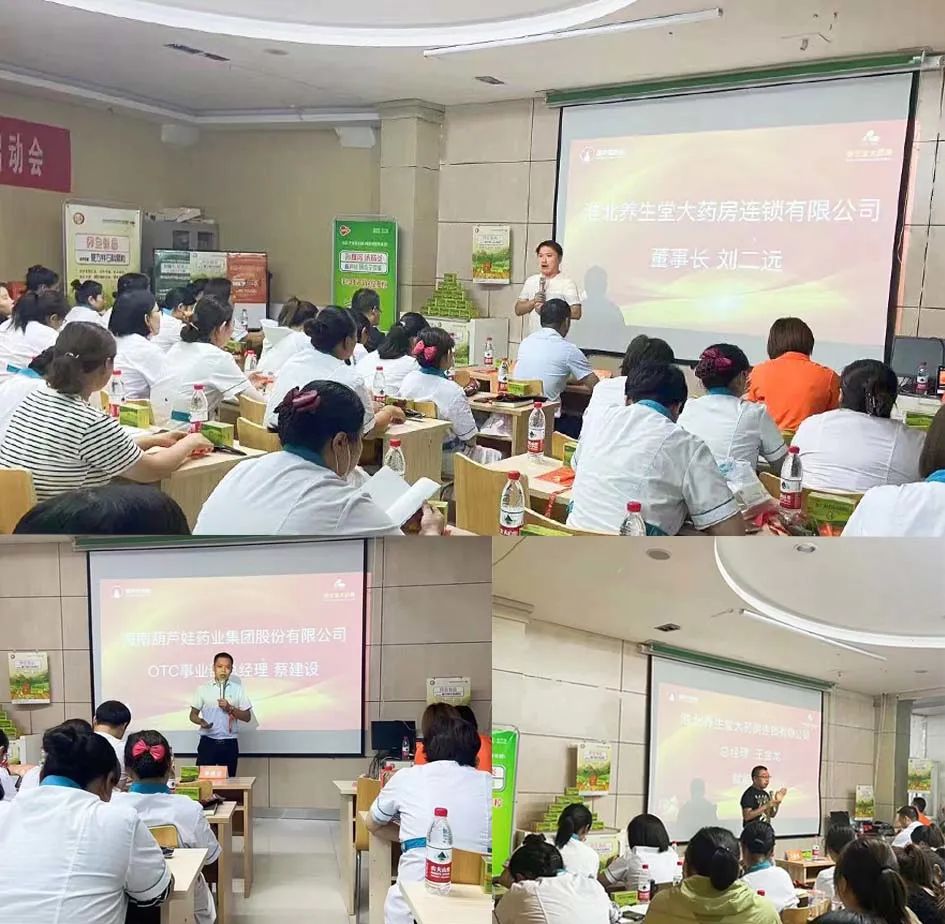 会议期间,淮北养生堂大药房连锁有限公司董事长刘二远、葫芦娃药业集团营销中心总经理助理兼广域事业部总经理蔡建设分别就此次活动进行了重要讲话,表达了夏日爆破活动品牌共建、专业赋能的战略意义。葫芦娃药业集团OTC事业部安徽省区经理朱给对爆破战役门店的激励政策及推广赋能做了深入培训。