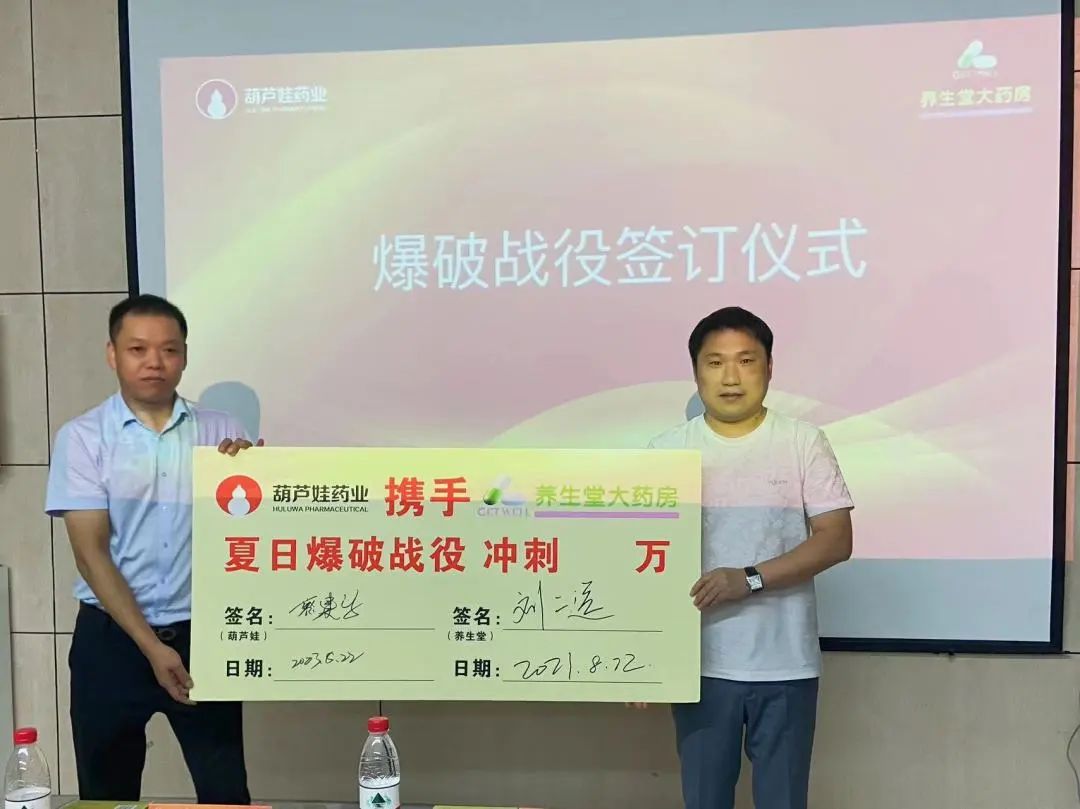 在会议上,淮北养生堂大药房连锁有限公司董事长刘二远、葫芦娃药业集团营销中心总经理助理兼广域事业部总经理蔡建设成功进行了爆破战役的签订,双方强强联手,精诚合作更进一步。