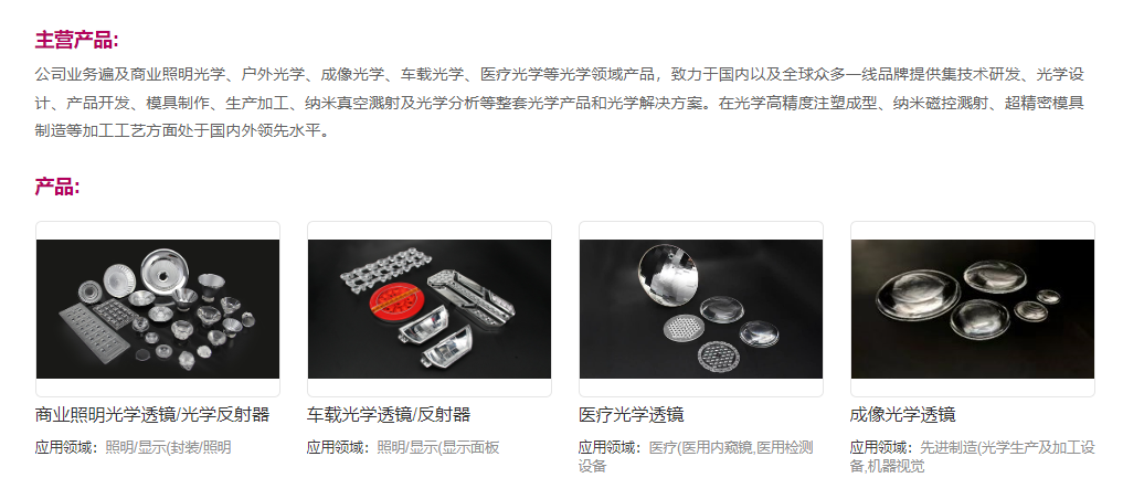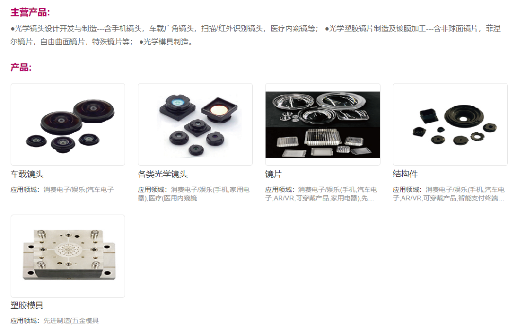 中山市众盈光学有限公司成立于2005年11月,为国内最早一批引进非球面超精密加工设备的企业之一,在光学模具制造及镜片注塑加工领域具备行业领先水平。公司可提供从光学设计、光学模具制造、注塑成型、镜片镀膜到镜头组装的全套服务。主要产品涵括各类镜片注塑成型及镀膜,精密光学零件,镜头定制开发及组装等。产品应用领域包括高像素手机摄像模组、微型投影机、医用内窥镜及胶囊内窥镜系统、指纹扫描、车载ADAS、车载前装HUD方案、红外识别、激光测距、扫码设备、智能家居、虚拟及增强现实设备(AR/VR)等。使用进口的超精密加工机床、注塑机、真空镀膜设备、全自动生产线以及检测设备,产品精度在国内同行业中处于领先地位。