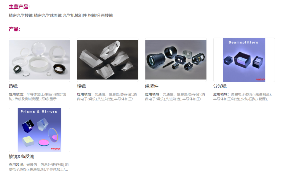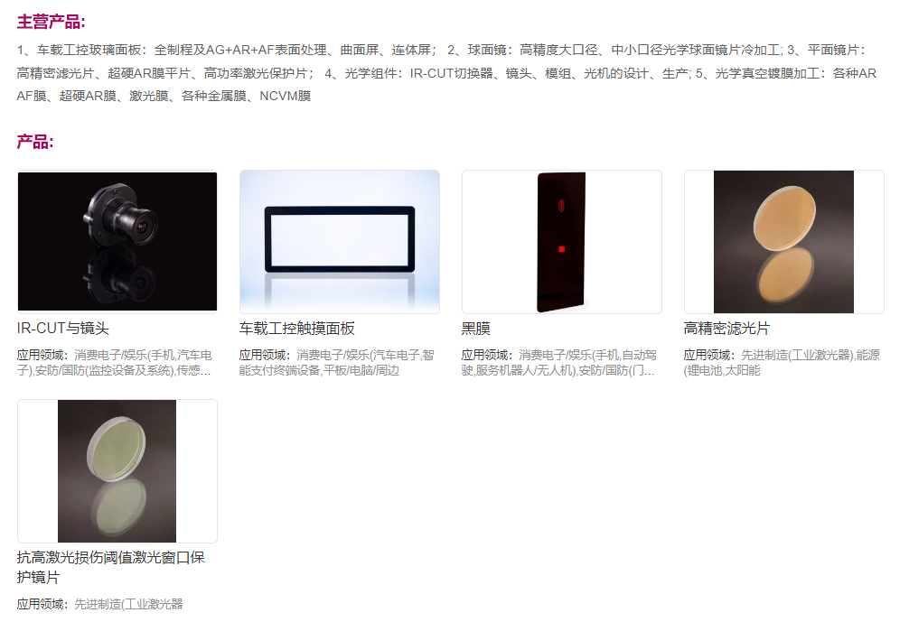 独特的竞争力: 1.新加坡独资公司,拥有经验丰富的光学制造、技术和应用团队 2.车光轴加工能力,光学对芯精度 10″以内,空气层 5μm以内 3.高精度光学元件,光学透镜LENS 直径φ2.5-φ120mm,半球球径、鱼眼形、高精度面形3/ 1(0.15/0.1)Rq<0.6nm;棱镜:各种非标角度 、多角形、角锥角度 <2″,屋脊棱镜精度<1”,菱线零破边 4.能够处理敏感的透镜材料,镀膜能力:AR(400-700nm,R<0.25%) ,金属膜:金膜、银膜、铜膜、铝膜及高层介质膜 5.高端检测设备:干涉仪10台(其中ZYGO干涉仪4台)、镀膜光谱检测仪3台、自动偏心仪2台,角度仪4台。