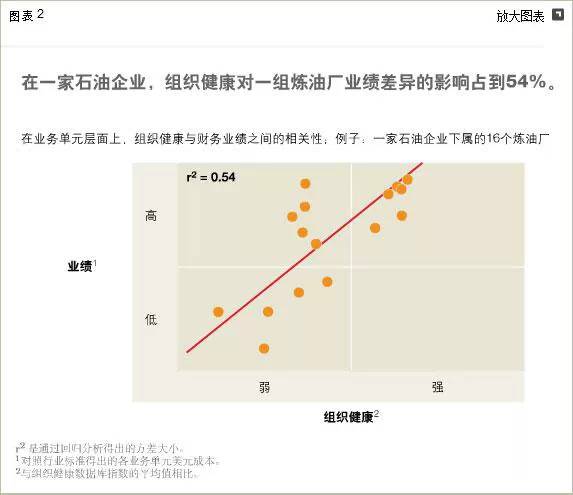 文化健康是从企业目前的文化是否能够适应企业所处的经营环境,能否激励员工提高效率思考的。根据麦肯锡研究,一个组织文化健康与业绩之间有很强的正相关性,如下图: