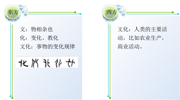 其次,我们需要知道古来人们是如何理解文化的,不同民族和不同文化下对文化理解不一致的,比如西方人理解文化往往从产业角度理解,中国人理解则从生命生长与化解矛盾解释的。如下图: