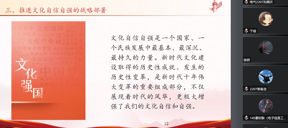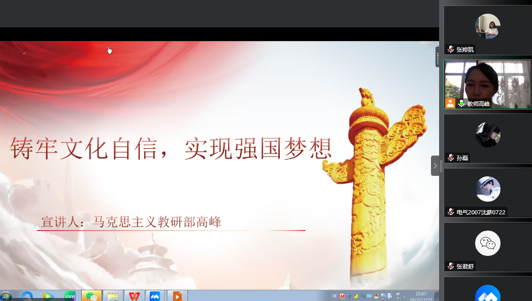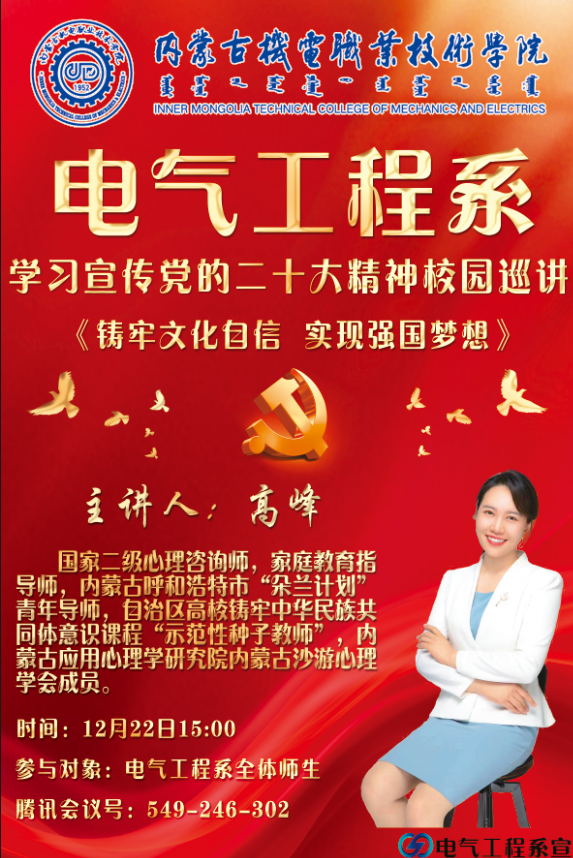 按照学院《关于深入学习宣传贯彻党的二十大精神校园巡讲的实施方案》要求,为全面深入学习宣传贯彻党的二十大精神,凝聚思想共识、 激发奋进力量,用党的创新理论武装头脑、指导实践、推动工作,2022年12月22日下午,电气工程系携手职业培训与中职教育部开展学习贯彻党的二十大精神校园巡讲,学院巡讲团成员、马克思主义教研部高峰老师以《铸牢文化自信 实现强国梦想》为题进行宣讲。本次巡讲活动由电气工程系党总支副书记张婷凯主持,电气工程系和职业培训与中职教育部全体师生聆听本次讲座。