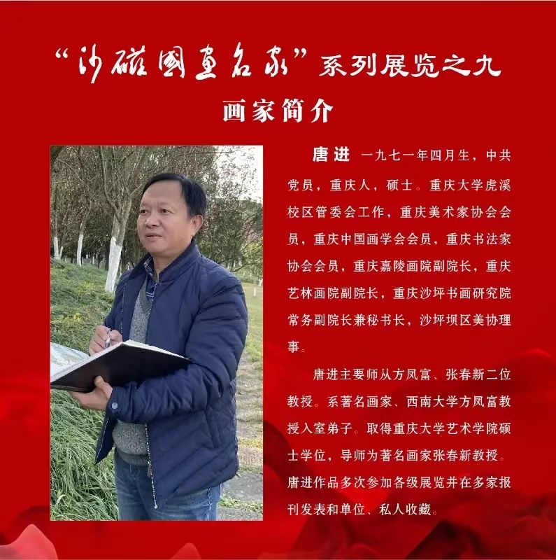 唐进一九七一年四月生,中共党员,重庆人,硕士。重庆大学虎溪校区管委会工作,重庆美术家协会会员,重庆中国画学会会员,重庆书法家协会会员,重庆嘉陵画院副院长,重庆艺林画院副院长,重庆沙坪书画研究院常务副院长兼秘书长,沙坪坝区美协理事。