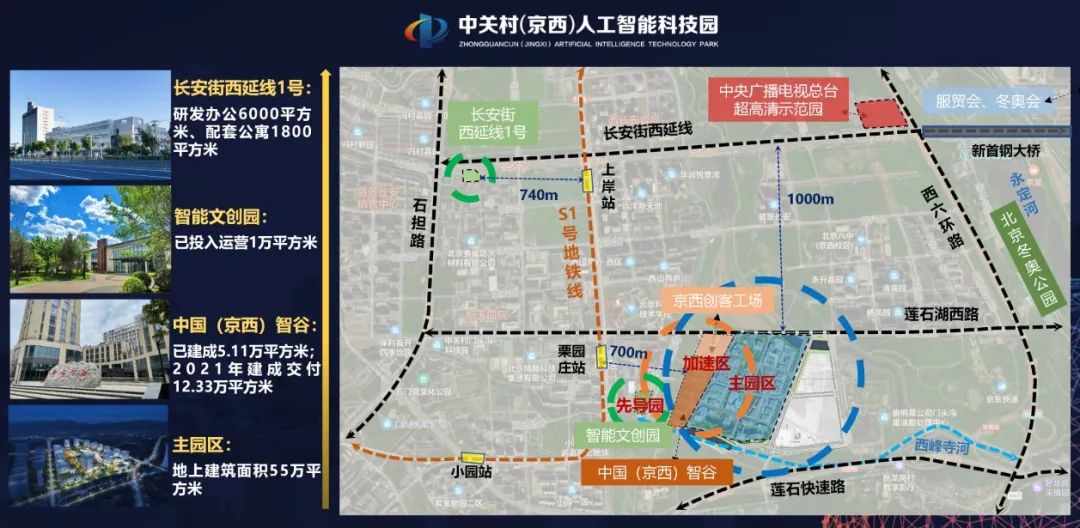 中关村(京西)人工智能科技园是长安街边上的中关村科技园,享有“城区的区位、郊区的政策”,在中央广播电视总台超高清基地、华为+百度人工智能计算中心、阜外医院西山园区暨国家心血管病研究中心、中关村精雕智造创新中心等引领性重大项目和关键技术服务平台的支撑下,重点承载AI赋能其他传统产业的AI+细分方向,优先聚焦视听+AI、医疗+AI、制造+AI。目前已有中国(京西)智谷(约20万平米)、长安街西延线1号、智能文创园等可供大中小企业租用或购置入驻的高品质特色产业载体,大型企业在满足要求的情况下也可选择在主园区购地自建。
