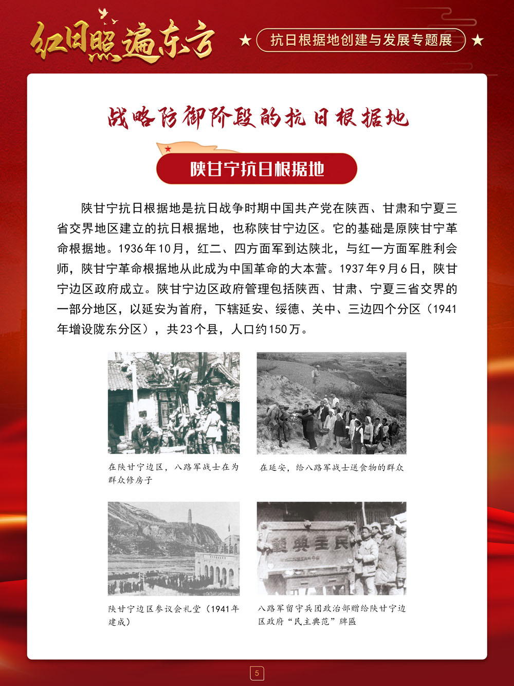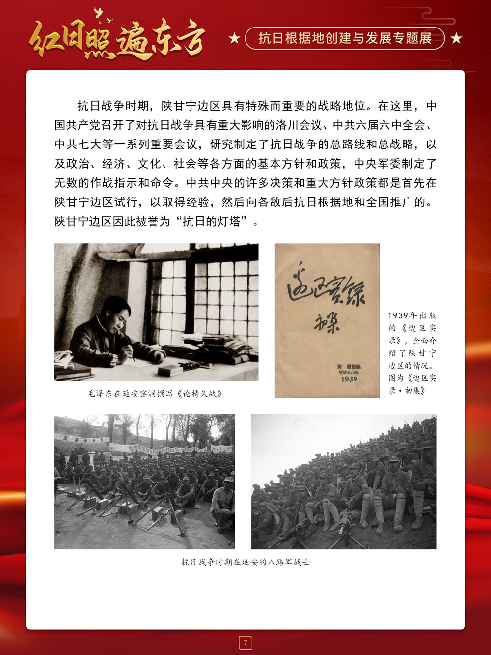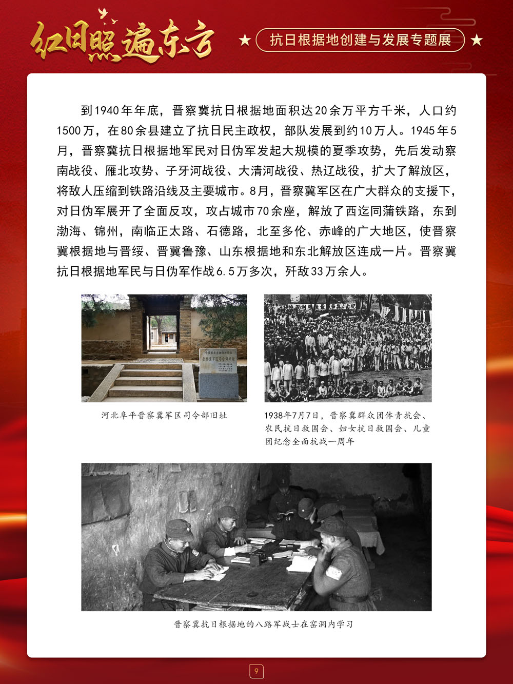 值此中国抗日战争胜利纪念日来临之际,请跟随我们的展览一起回顾那血与火的风云岁月,盘点那些在艰苦卓绝的斗争中建立起来的抗日根据地及其政治、经济和文化建设,弘扬抗战精神,赓续红色血脉,在新时代,继续朝着中华民族伟大复兴的中国梦奋勇前进!