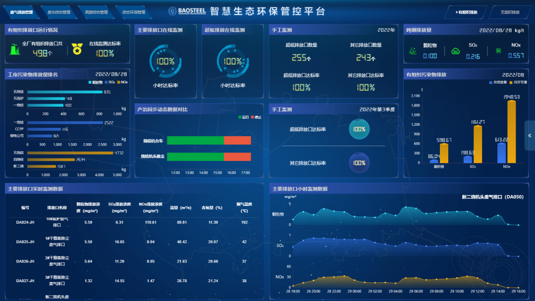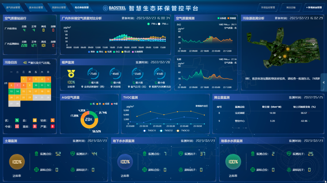 2022年6月,国内首套覆盖废气排放管理、废水综合管理、固废综合管理、综合环保管理的智慧生态环保管控系统在中国宝武集团武汉钢铁有限公司正式上线运行。系统利用5G技术超高速、超低延迟响应的特点,实现了覆盖焦化、烧结、炼铁、炼钢、轧钢、热电的全流程千万吨级钢铁企业的智慧生态环保监测监控数据实时采集及展示,建成全厂TSP、空气微站、VOC监测仪和视频监控设备共600余套,通过空气质量预测、排放污染物浓度预测、厂内污染源溯源分析、环保监测数据智能诊断、大数据分析等模型技术,为企业的环保管理提供数据分析和决策支持。中冶京诚智慧生态环保管控系统的首创应用,具备行业引领作用。