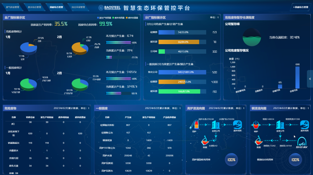 全流程准确跟踪、全面展示厂内固危废的产生、利用、暂存、处置的变化情况,暂存库仓满程度预警。融合手机移动端APP形成固废出、入库标准操作流程,有效降低劳动强度,提高工作效率。