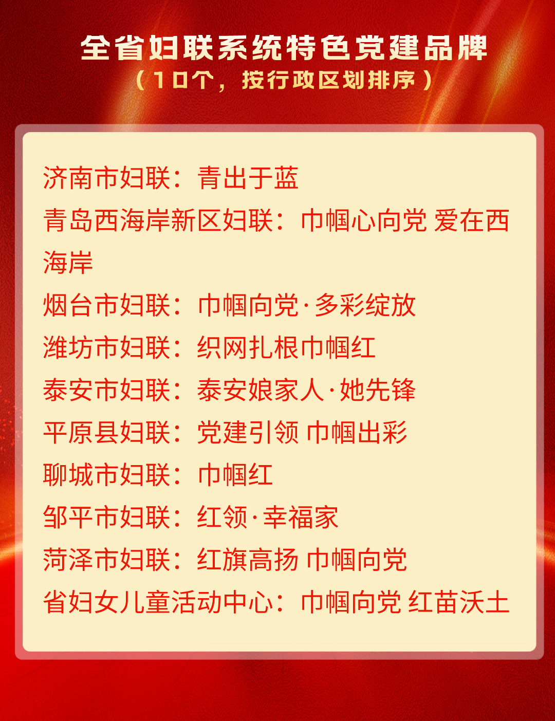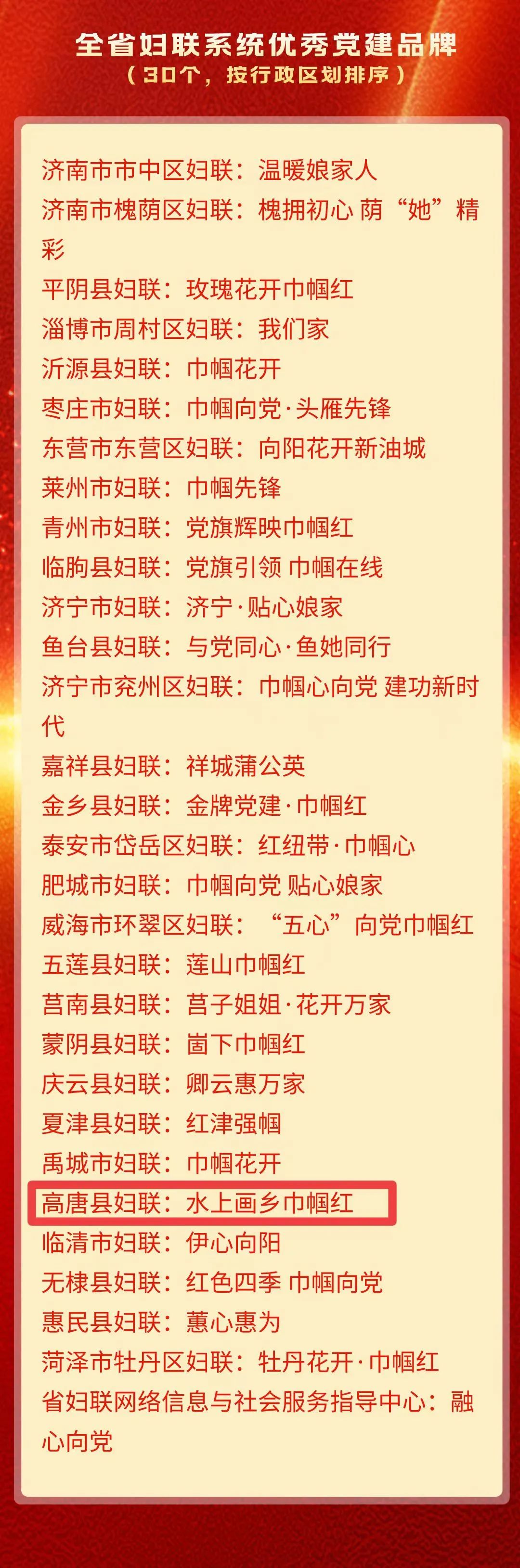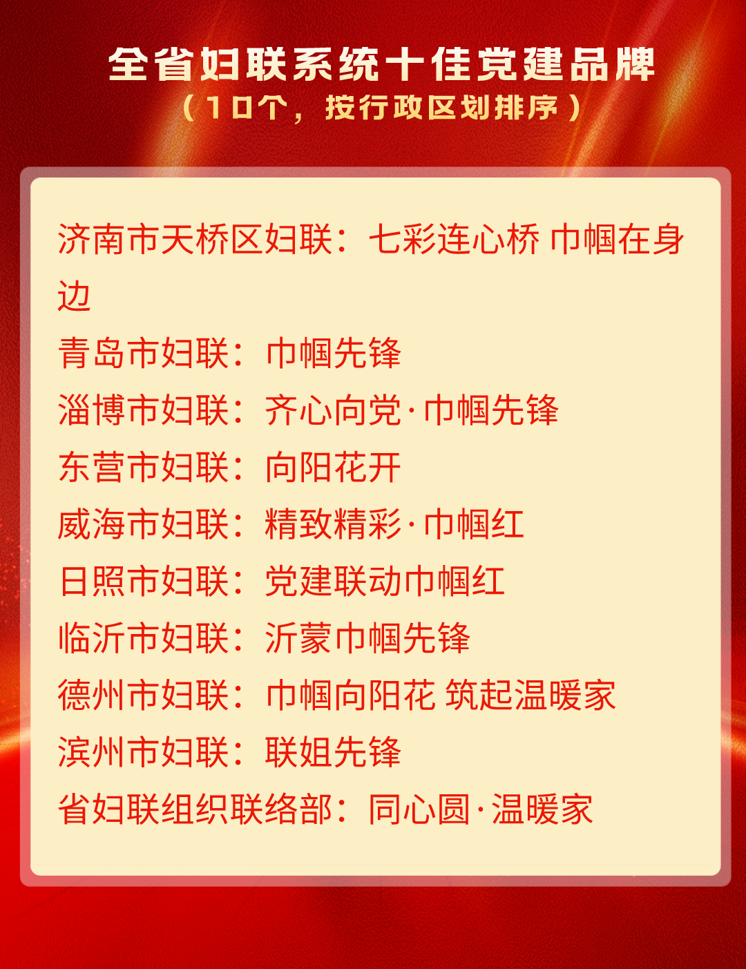 为深入开展学习贯彻习近平新时代中国特色社会主义思想主题教育,总结推广全省妇联系统机关党建品牌创建经验,激发基层党组织工作活力,促进党建业务深度融合,打造“1+N”全省妇联系统党建品牌矩阵,山东省妇联面向市、县(市、区)妇联和机关部室(单位),组织开展全省妇联系统优秀党建品牌征集活动。在各级推荐申报基础上,经综合评审,“全省妇联系统十佳党建品牌”“全省妇联系统特色党建品牌”“全省妇联系统优秀党建品牌”名单于近日公布。
