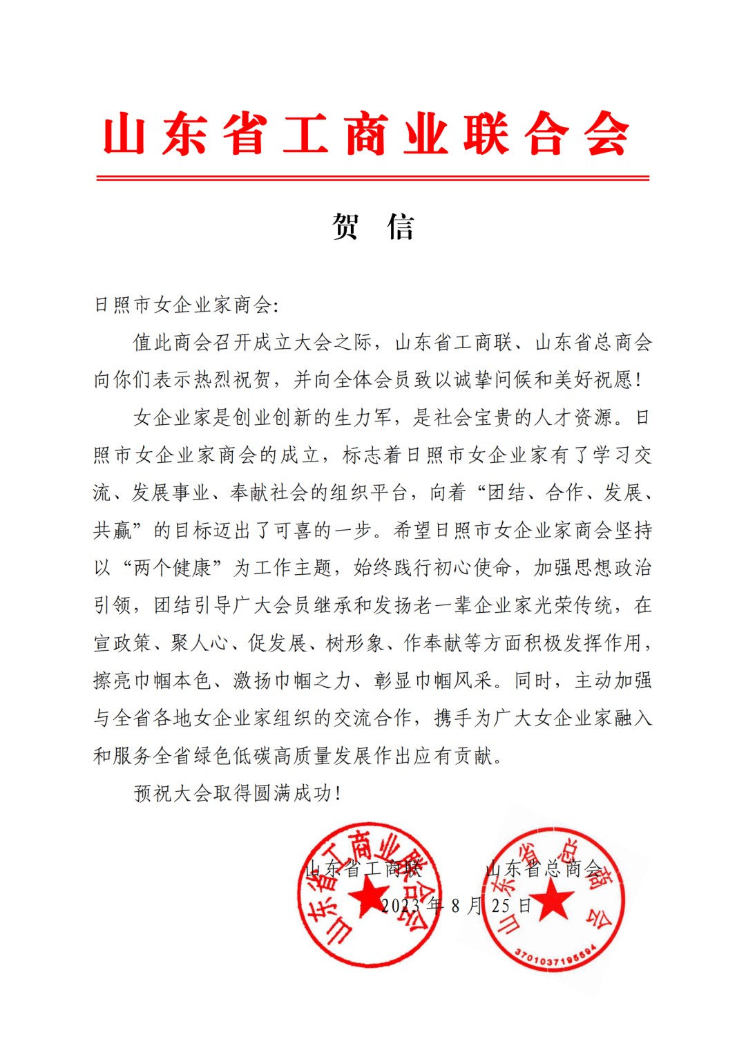 长风破浪会有时,直挂云帆济沧海。日照市女企业家商会的成立,是日照市女企业家肩负新使命、扛起新担当、展现新风采的新起点。下一步,女企业家商会将团结和带领广大会员自觉践行社会主义核心价值观,弘扬企业家精神,加强合作交流,在科技创新、乡村振兴、转型升级、产业配套、体制创新等方面大显身手,把女商会打造成为“知识型”“智慧型”的新女性商务之家,凝聚巾帼力量、彰显巾帼作为、展现日照女企业家商会的风采,为谱写现代化海滨城市精彩蝶变新篇章做出应有的贡献!