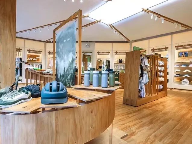 遵循对品牌的理解,蕉下将「露营」、「帐篷」等轻量化户外场景元素引入门店空间设计:店内阳光充盈,绿野惬意,露营、帐篷等场景让户外更有实体感;三面玻璃墙体的外立面,保留一定通透性,让往来游人一眼就能感受到户外气氛;转入店内中场,木质的骑行栈道,让人不禁联想到户外骑行时风从脸庞吹过的情形;试衣间的门帘用的则是与露营感相称的帐篷布,营造户外空间和情绪的鲜活。