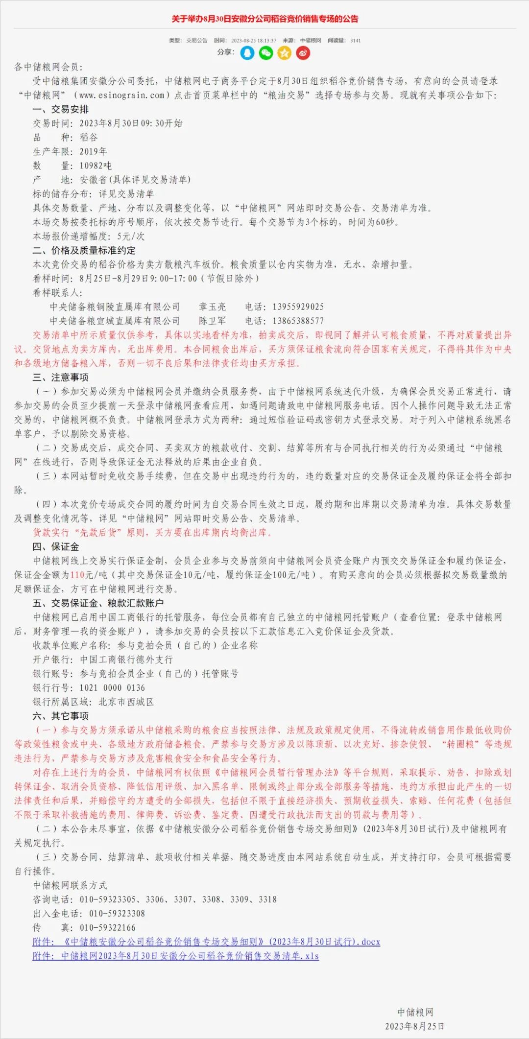 关于举办8月30日安徽分公司稻谷竞价销售专场的公告