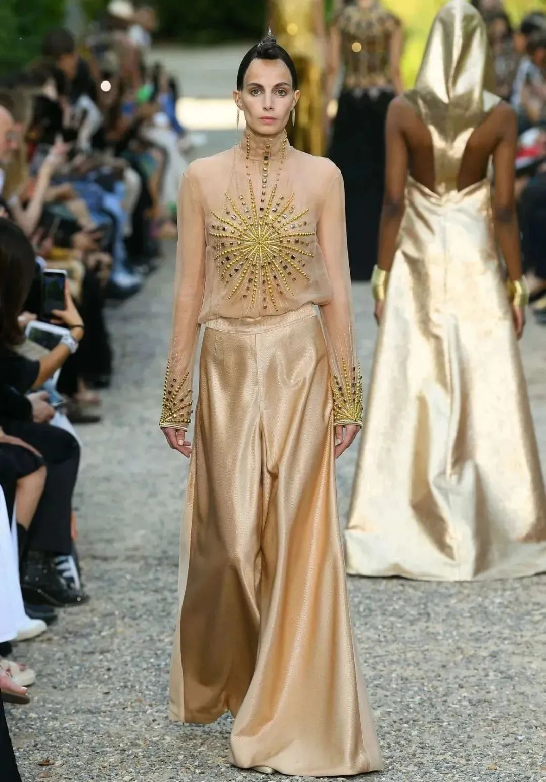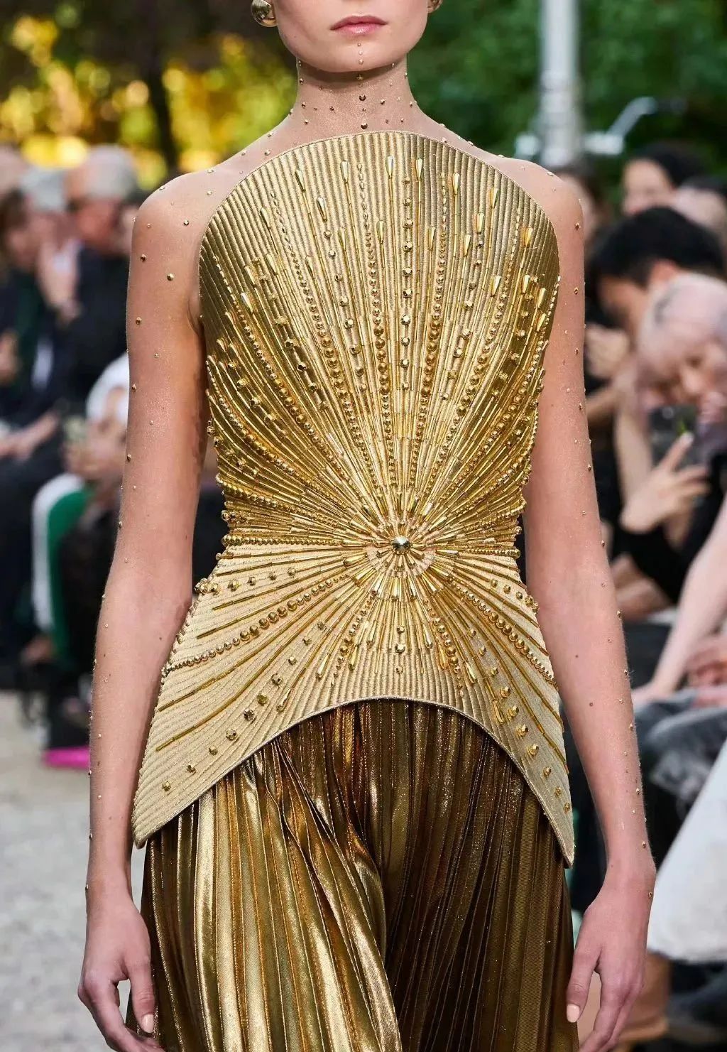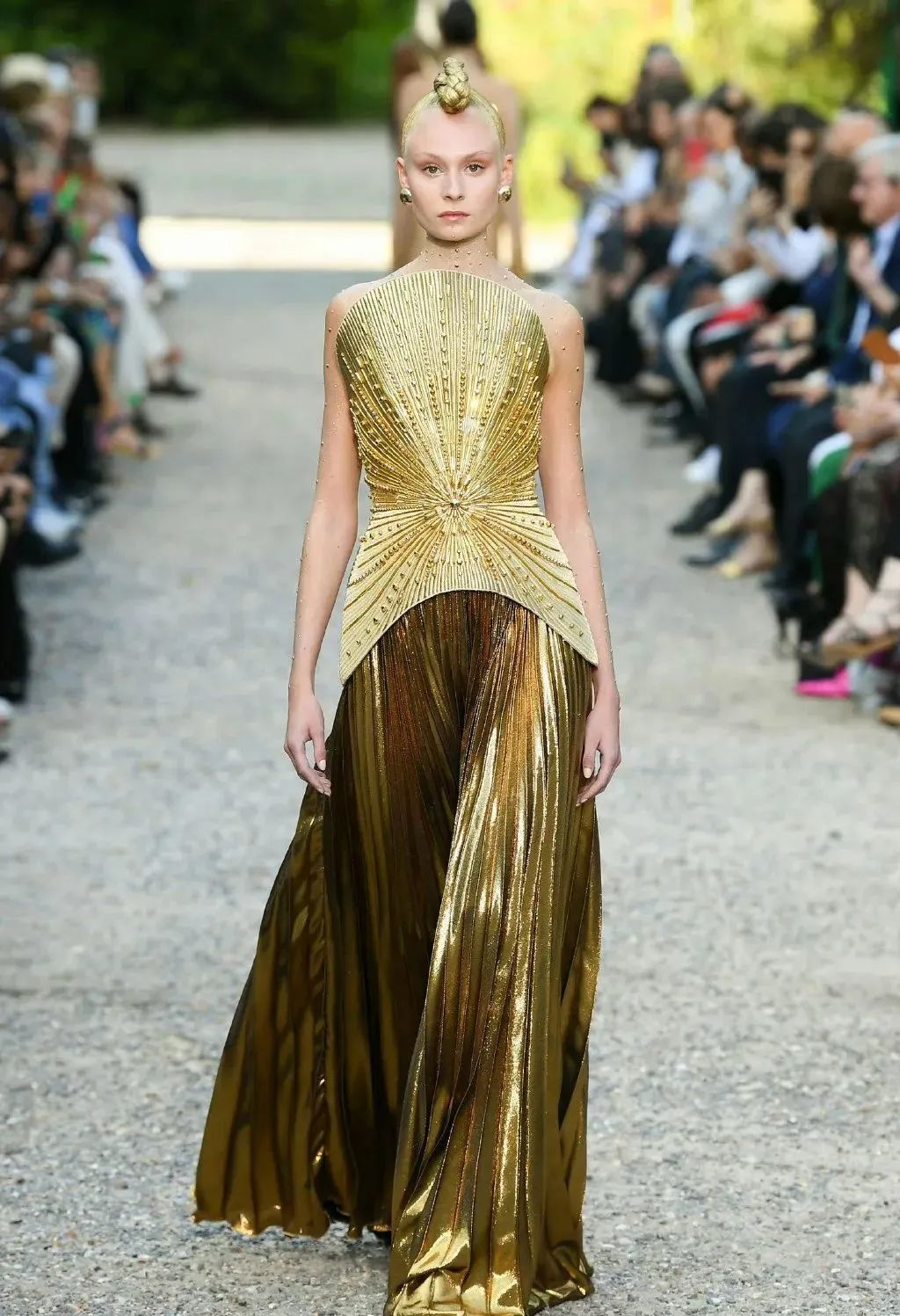 硬挺独特的建筑线条,充满现代性利落的剪裁,缀满全身的金色水钻,配以干净整洁的妆造,在宁静幽香的花园背景衬托下,就像是一幅神圣优雅的画~