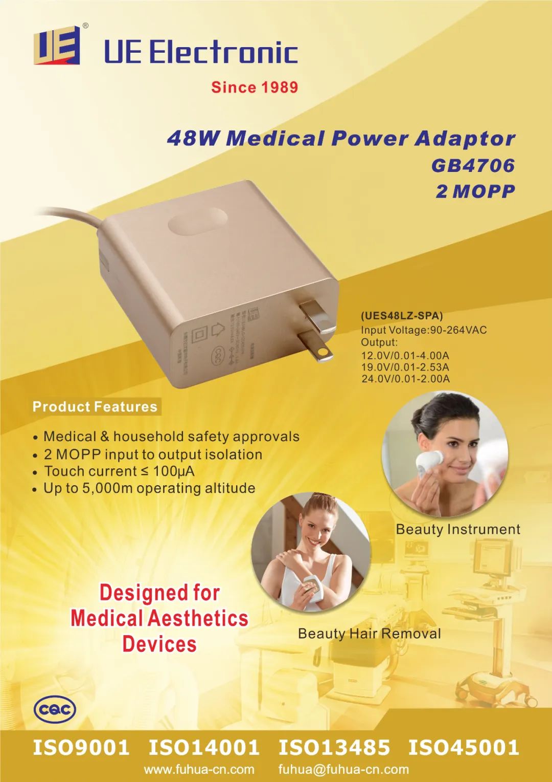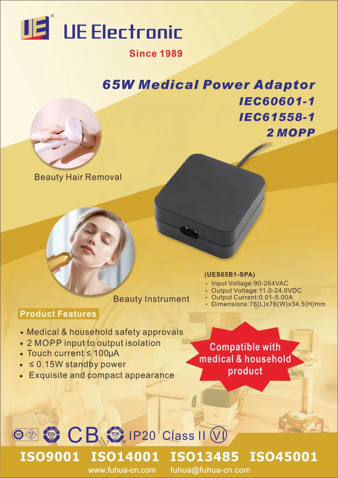 此次展会,UE Electronic将给大家带来最新研发的医疗电源全系列。功率涵盖5~240W,符合六级能效,2MOPP标准,认证齐全,插墙式/桌面式/基板式可选,广泛应用于各类医疗器械设备。