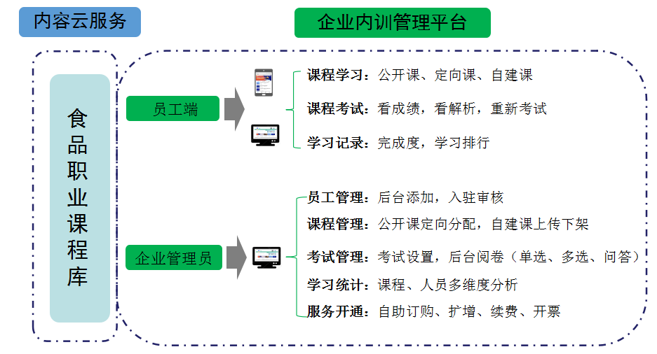 食学宝企业版是食学宝面向食品企业开发的内训培训平台,为企业提供在线学习和培训管理服务。平台汇聚食学宝几百门食品课程资源,同时系统支持课程自建上传,考试阅卷、员工管理、学习统计、动态通知等功能,帮助企业建立培训体系,管理员工培训。