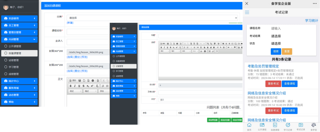 3、企业管理者可以在后台管理员工,创建考试,查看员工学习、考试数据,统计学习情况等等。