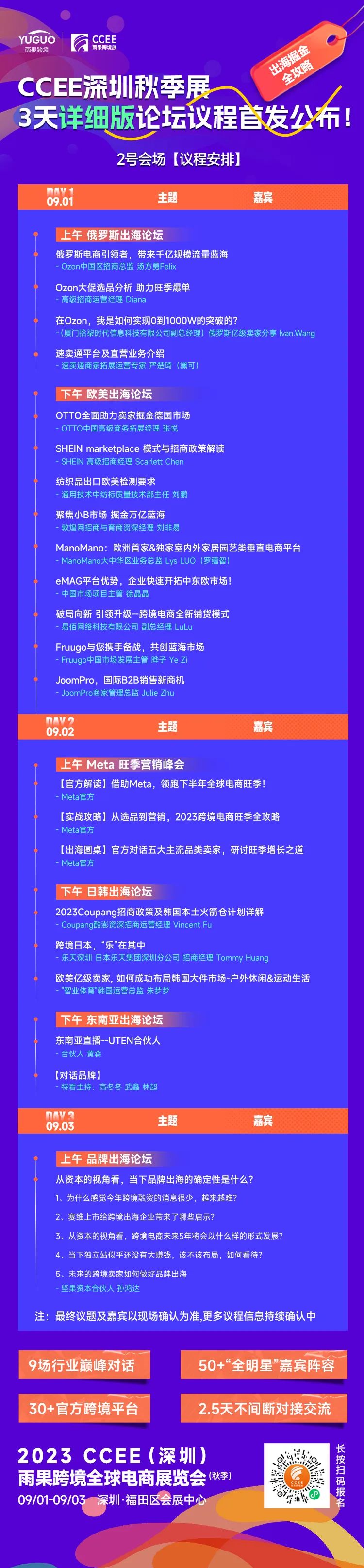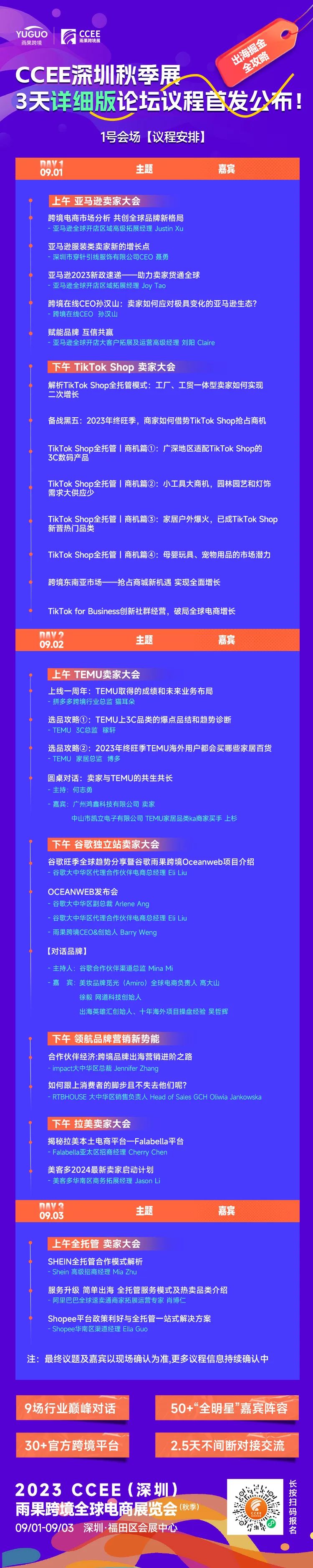 展览面积45000+平方米,百家源头工厂齐聚深圳,覆盖全国20+产业带。展出品类涵盖:消费电子、母婴玩具、鞋服箱包、户外运动、家纺布艺、家居百货、家装建材、美妆个护、宠物文具、汽配五金、灯饰照明、数码家电十二大跨境热门品类。本次雨果跨境聚拢跨境产业生态圈资源,独创设立平台生态展区。涵盖亚马逊、东南亚、Google独立站、俄罗斯、拉美电商、亚非电商和MCN,7大热门市场平台生态。为期三天的展会将举办12场论坛大会,主流平台卖家峰会及热门市场出海论坛集中亮相,聚焦海外市场趋势、出海营销思路、旺季选品方法等时下热门议题,带来一系列重磅分享。展会期间将连续举办亚马逊、TikTok Shop、Temu、Google、Meta、拉美主流平台和全托管平台千人大会,各平台高管带领众多平台经理集体亮相,现场交流。诸多新平台与众多出海品牌“同台共舞”,联手传授2023年品牌出海新策略。其中不乏首度亮相、链接中国卖家的海外本土“新锐平台”以及多位品类大卖,为卖家全方位破解多平台布局迷思!行业独创升级平台、卖家、服务商、线下聚会模式。展览期间首度开创了老板会员、主流平台及热门品类三大线下交流专区,展会期间组织行业各式圈层聚会交流。千人峰会、万人齐聚!全球主流电商平台、跨境行业大咖齐聚,八方宾朋,齐瞻未来,让跨境展会变为行业大聚会。更有2024最新卖家启动计划、各官方平台1v1实战指导!