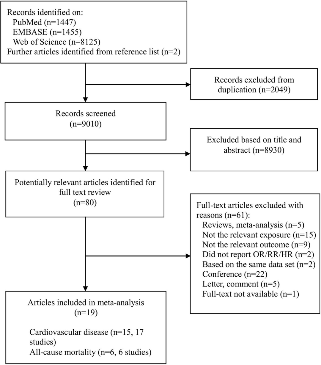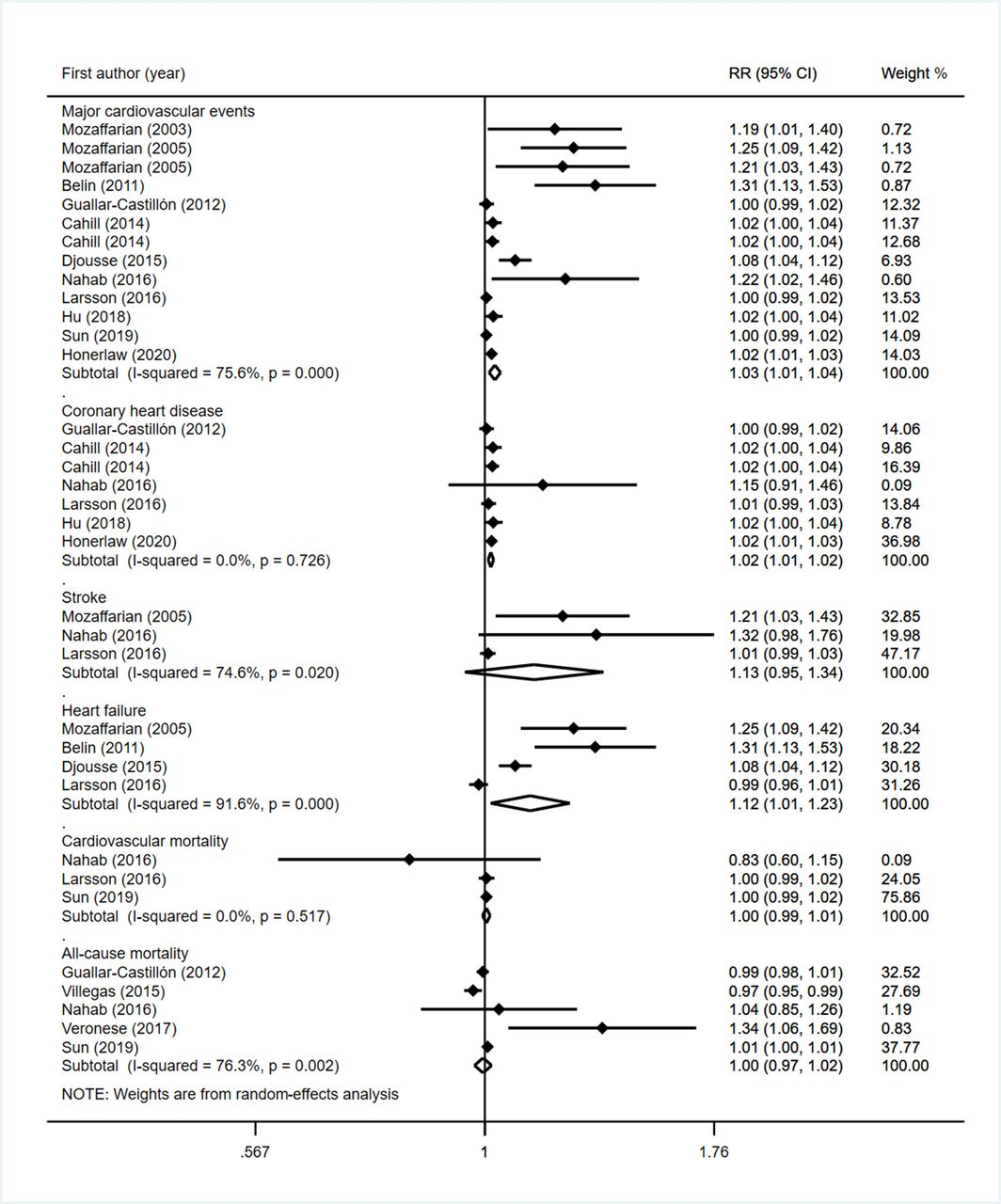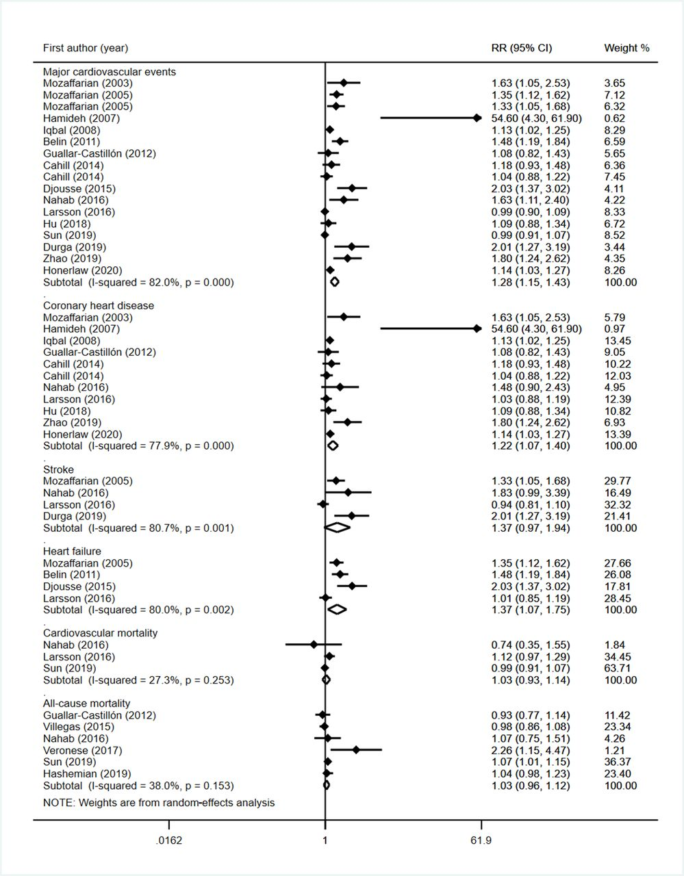 然而,油炸食品被世界卫生组织列为垃圾食品之首,它的危害远超过你的想象力,但其是否会增加心血管疾病(CVD)的风险和死亡率仍不清楚。近日,广东省深圳大学医学部公共卫生学院流行病与卫生统计学副教授胡付兰博士等人发表在《Heart》杂志上的一项荟萃分析发现,油炸食品的摄入与罹患主要心脏病和卒中的风险增加有关。研究人员检索了PubMed、EMBASE和Web of Science数据库中截至2020年4月发表的相关研究,筛选出19项相关研究。最终利用其中17项研究,纳入562,445名参与者和36,727个主要心血管事件(如心脏病发作或卒中)数据,以评估CVD的风险;并利用其中6项研究,纳入754,873名参与者,以及在平均监测期为9.5年期间85,906例死亡患者数据,以评估油炸食品消费与CVD和任何原因死亡之间的潜在联系。图2. 最高与最低油炸食品摄入量和主要心血管疾病事件、冠心病、卒中、心力衰竭、心血管死亡率和全因死亡率风险的森林图
