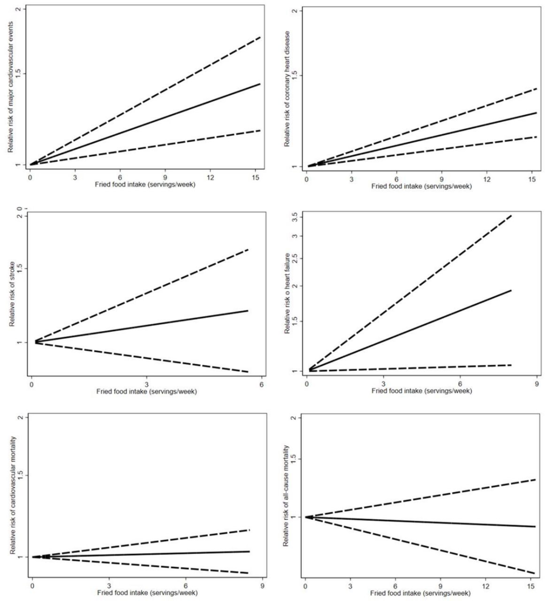 图3. 采用限制性三次样条曲线建模油炸食品摄入量与主要心血管疾病事件、冠心病、卒中、心力衰竭、心血管死亡率和全因死亡率风险的剂量-反应关联