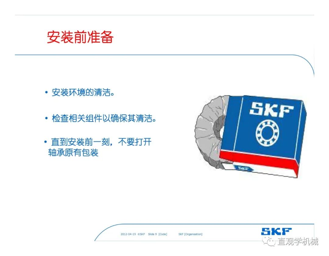 大家对SKF应该比较熟悉,SKF执世界滚动轴承业之牛耳,经营的触角已遍及全球,很多人直接或间接地都会接触到这个品牌的轴承,轴承能无故障运转在很大程度上与安装的好坏有关。SKF在安装前和安装时都拍摄了一些教学小视频,并制作了一些实用的培训PPt,今天小编就整理了一些,咱们就借花献佛,希望大家喜欢。