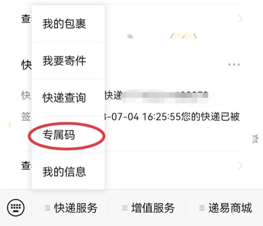 在①②区域取件时,打开“递易校趣”公众号,点击菜单栏“快递服务”中的专属码,把快递条形码和专属码一起放到扫码器下扫描,听到“出库成功”后就可以拿走快递啦!