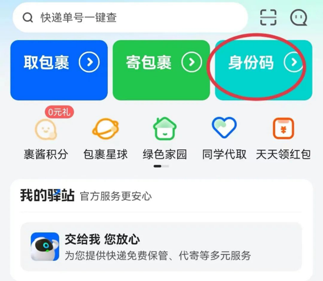 在⑤区域取件时,打开“菜鸟裹裹”APP,在首页点击“身份码”,把快递条形码和身份码一起放到扫码器下扫描即可~