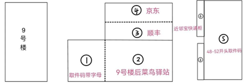 取件码“xx-x-xx”,第一位代表货架号,第二位代表货架层数,第三位代表快递的编号。根据取件码找到对应的货架,其中,货架号后带有大写字母的在①区域取件,货架号为48-52的在⑤区域取件,其他号码在②区域取件。