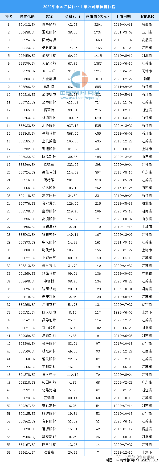 中商情报网讯:截止2022年12月30日,A股(包括上交所、深交所、北交所)光伏行业上市企业共有56家,总市值合计达24244亿元。从企业市值排名情况来看,隆基绿能、通威股份、阳光电源、晶科能源、晶澳科技为行业市值前五名,2022年总市值分别为3204亿元、1737亿元、1660亿元、1465亿元、1415亿元。2022年A股光伏行业上市企业总市值排名情况如下图所示: