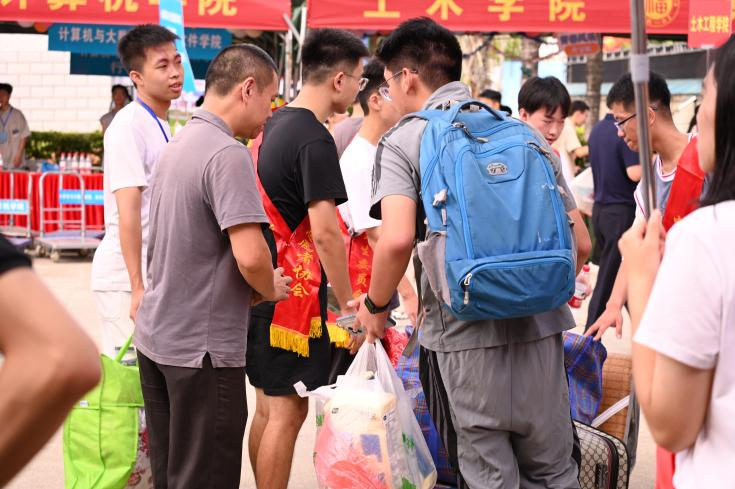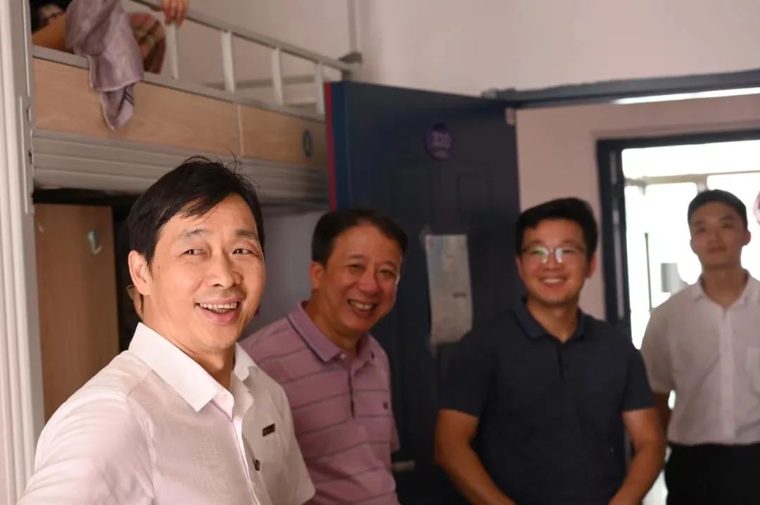 电气学院党委书记潘志辉老师、党委副书记钟钛申老师、副院长邵振国教授、副院长王武教授、党委委员舒胜文副教授和辅导员老师们,亲切慰问迎新现场工作人员,并深入新生宿舍,与前来报到的新生亲切交谈,向同学们表示热烈的欢迎。