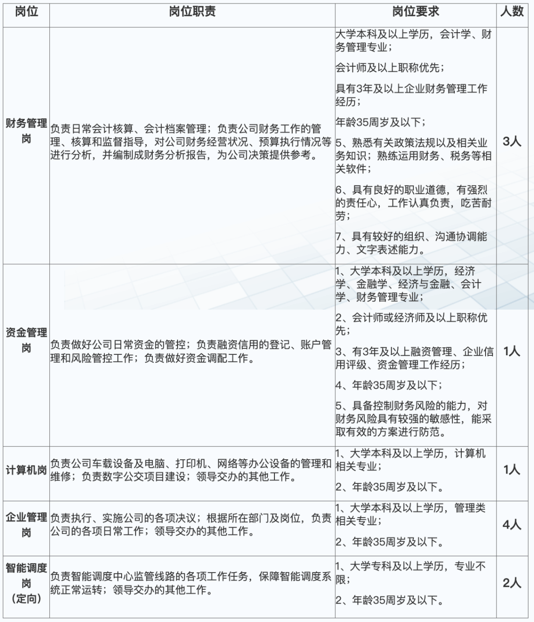 因公司工作需要,为进一步充实公司人员队伍,加快公司发展,宁波市北仑公共交通有限公司拟面向社会公开招聘工作人员11名。