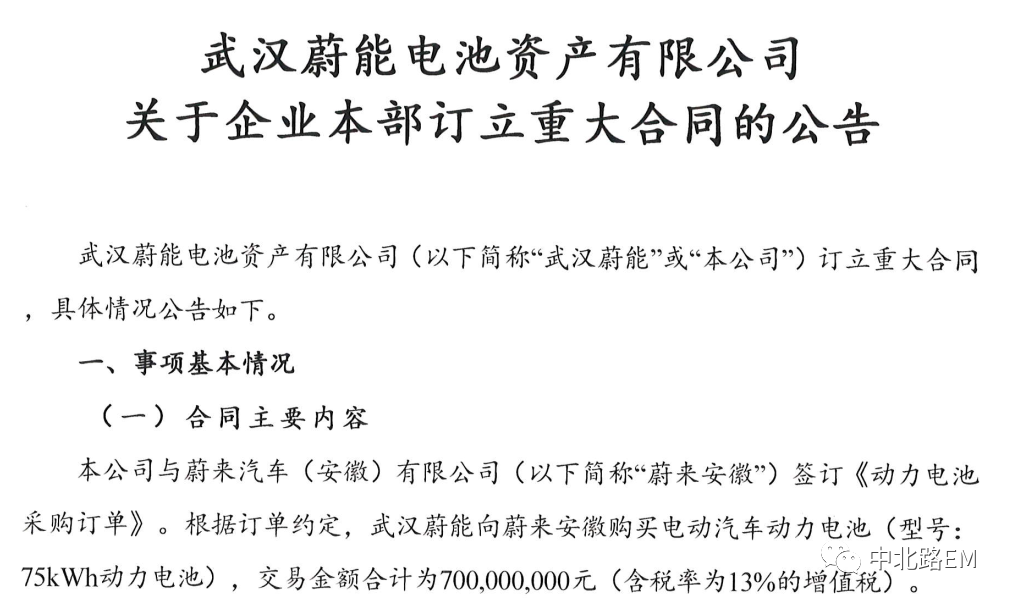 微信公众号中北路获悉,武汉企业:武汉蔚能电池资产有限公司关于企业本部订立重大合同的公告节选。
