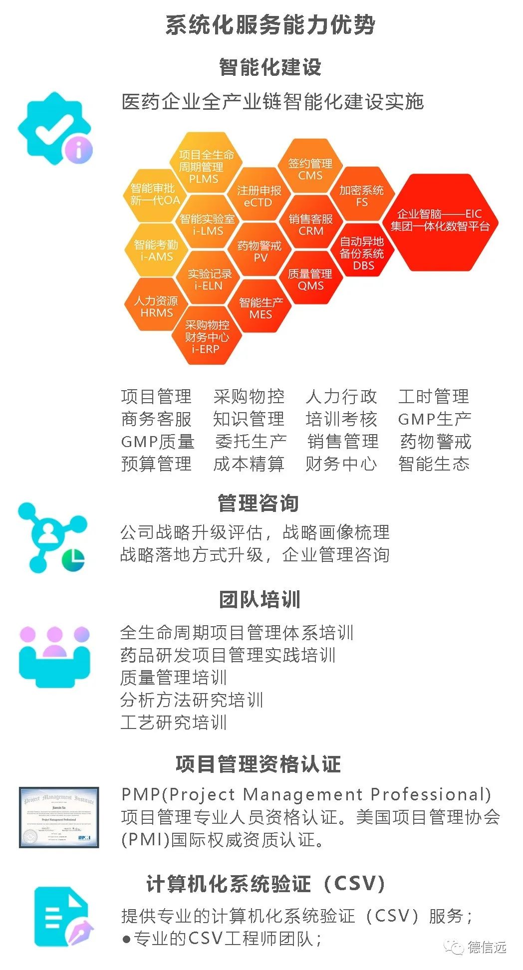 德信远智能匠心原创开发,铸就中国原创好软件!专注服务于医药领域智能化,拥有四地技术服务中心团队,为ISO27001信息安全保障体系、ISO2000信息技术服务体系认证、ISO9001质量体系的三体系国际认证单位,双软认证企业,南京市紫金山人才引进重点支持单位。