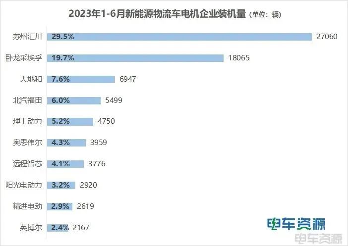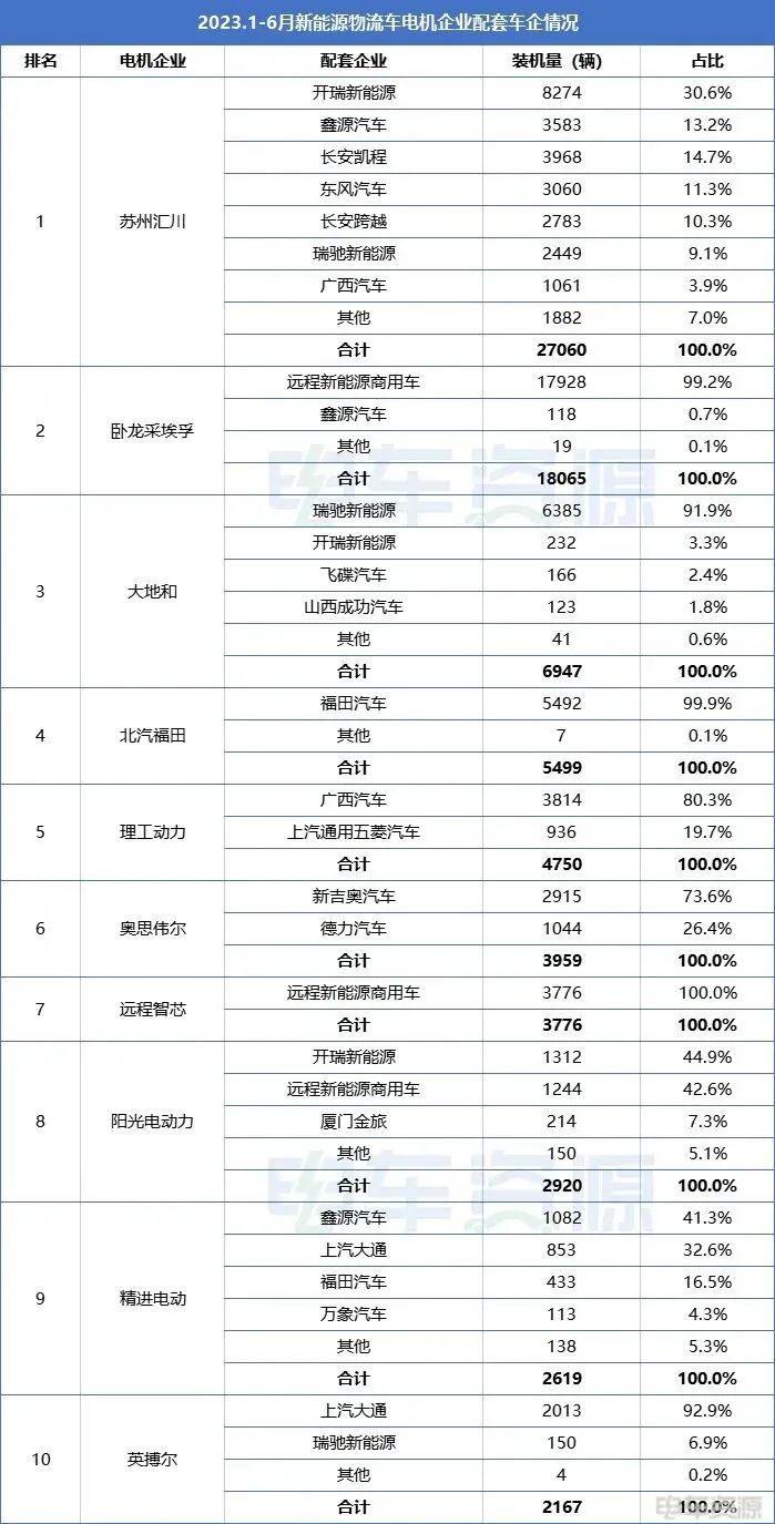 2023年1-6月,新能源物流车电机装机量TOP10企业分别为苏州汇川、卧龙采埃孚、大地和、北汽福田、理工动力、奥思伟尔、远程智芯、阳光电动力、精进电动、英搏尔。