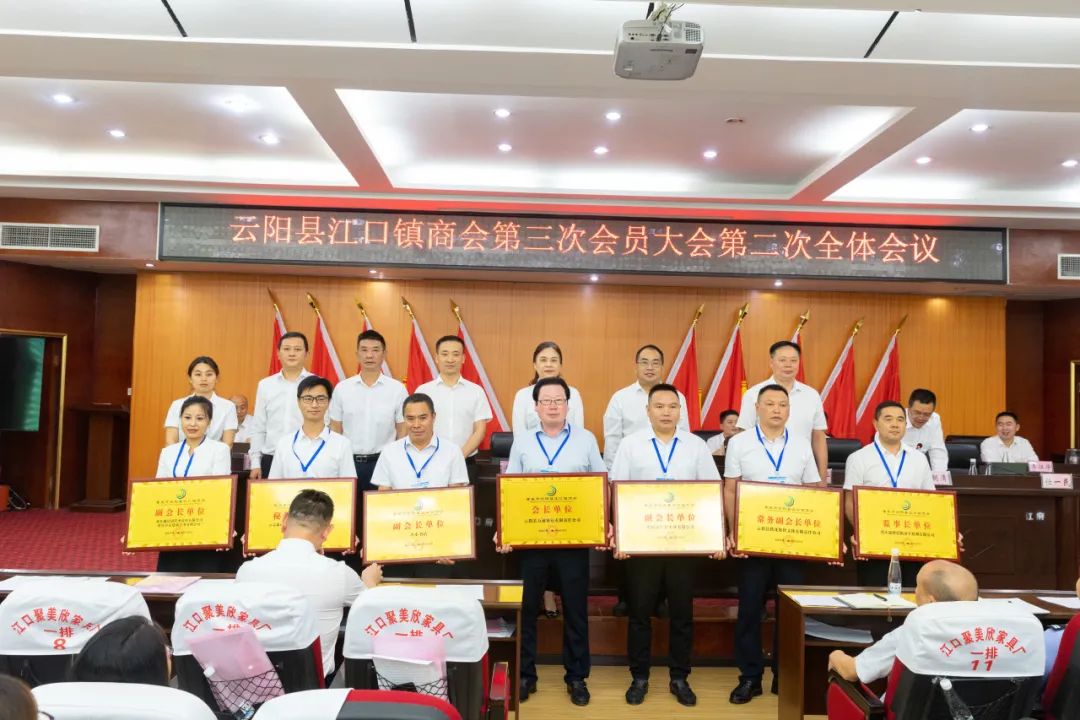 为当选的江口镇第三届商会会长、名誉会长、副会长、监事长、秘书长等授牌和颁发聘书。