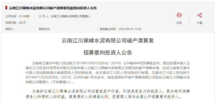 7月24日,“云南江川翠峰水泥有限公司破产清算案招募意向投资人公告”称,为维护云南江川翠峰水泥有限公司运营或资产价值,引进具有实力的投资人,更加有利保障债务人和债权人的权益,提高债权人的清偿比例,现管理人面向全国公开招募意向投资人。