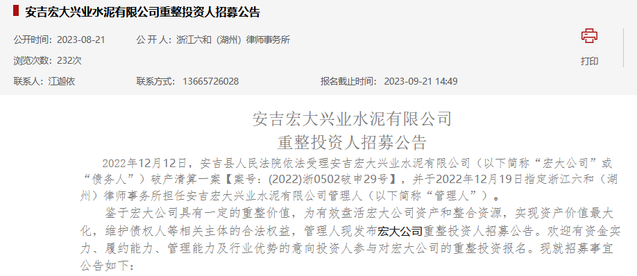 8月21日,安吉宏大兴业水泥有限公司重整投资人招募公告称,2022年12月12日,安吉县人民法院依法受理安吉宏大兴业水泥有限公司破产清算一案。鉴于宏大公司具有一定的重整价值,为有效盘活宏大公司资产和整合资源,实现资产价值最大化,维护债权人等相关主体的合法权益,管理人现发布宏大公司重整投资人招募公告。