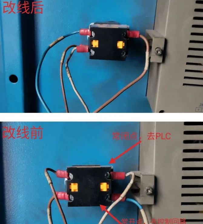 那么再来研究一下这个急停按钮。因为之前没修过空压机,也没有它的电气原理图纸,正常情况下,机电设备的急停按钮应该是接控制回路的常闭点,而检查发现这个急停按钮后面有两组线:一组接了常开,一组接了常闭。