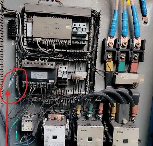 再捋后面的线,所有的接触器线圈电压,都是从控制变压器来的110V,控制变压器110V两根出线,一根进了PLC32号端子,一根进了保险去到急停按钮,因为刚刚查过了急停按钮没问题,就拿眼睛斜瞄了一下,没用万用表进行确认。