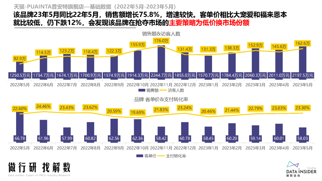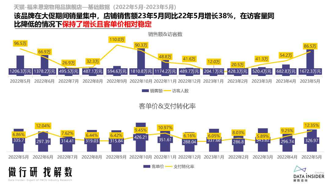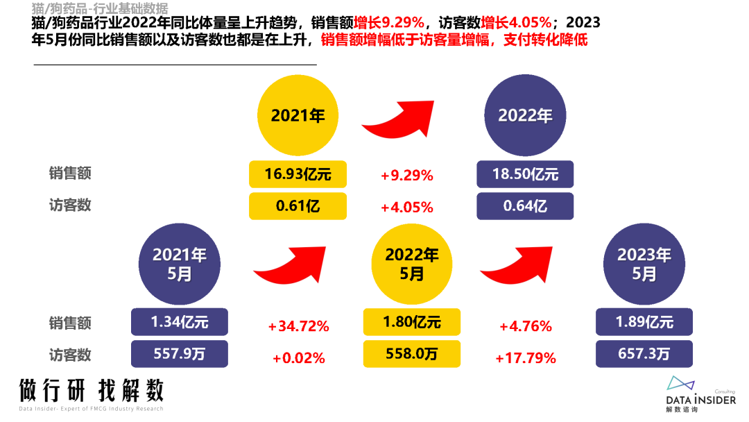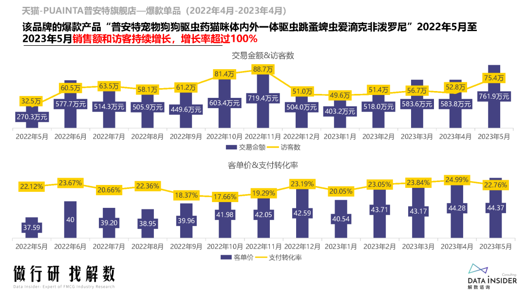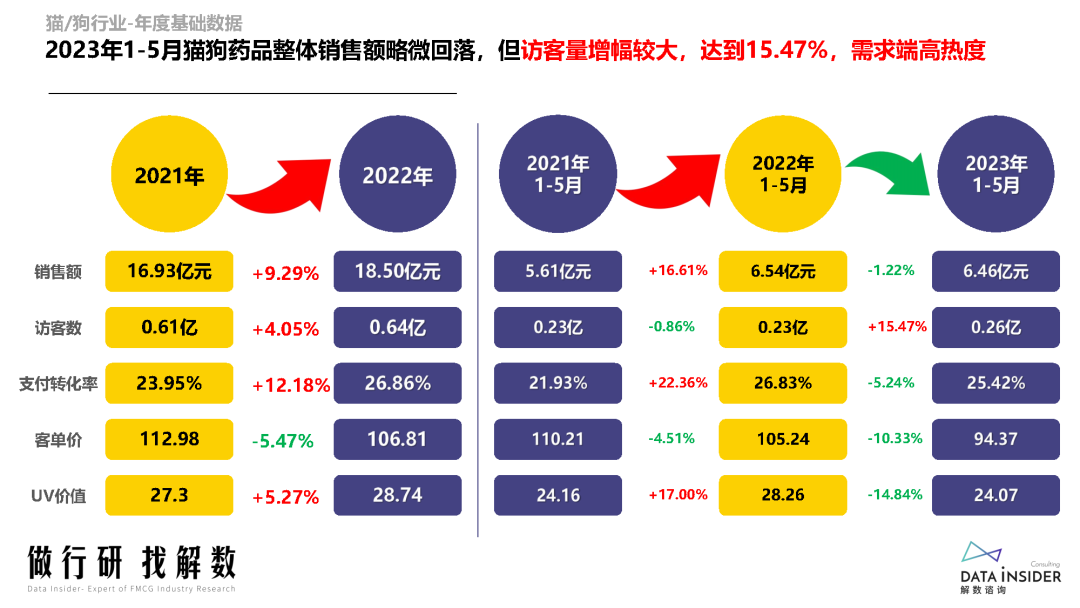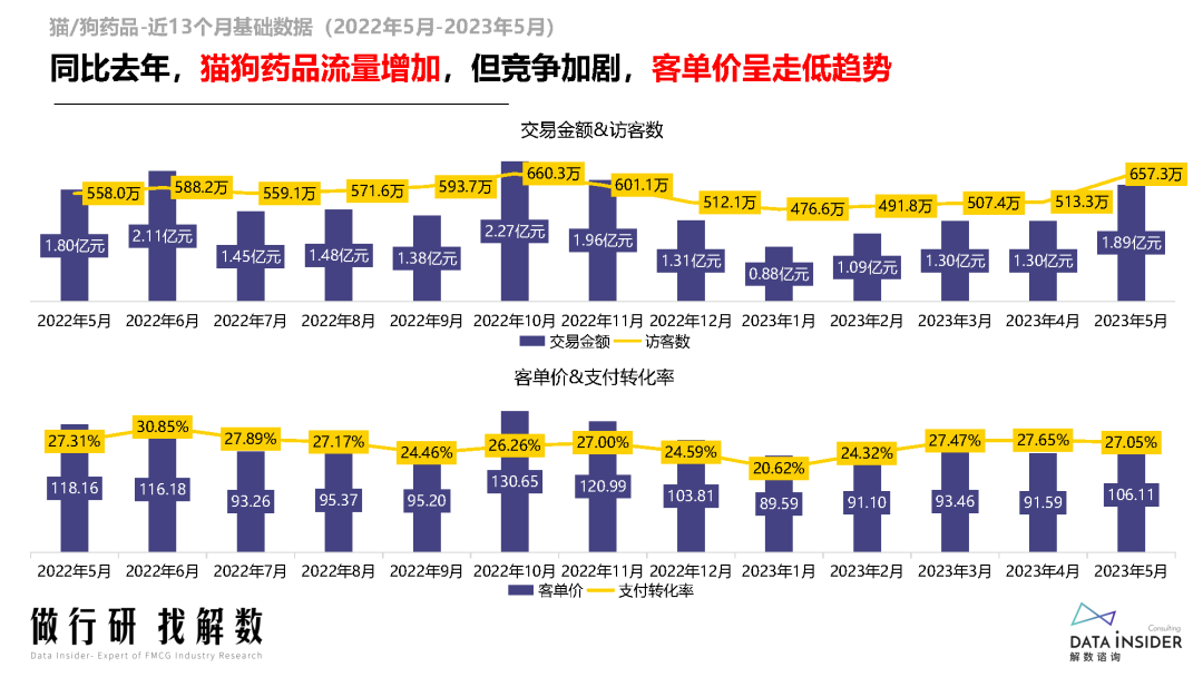 2023年1-5月,猫狗药品整体销售额虽然略微回落,但访客量增幅较大,显示出需求端的高热度。尽管客单价有所下降,但支付转化率却提高了一些,说明消费者对宠物药品的购买意愿和信任度在不断提高。