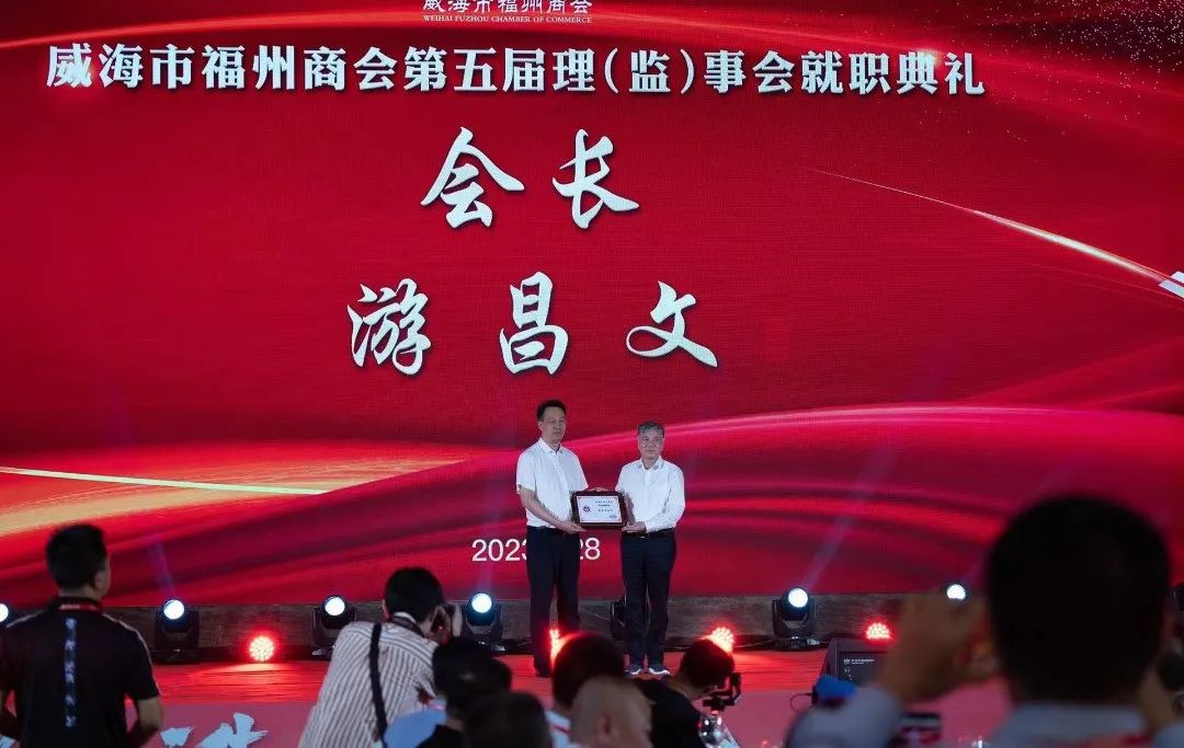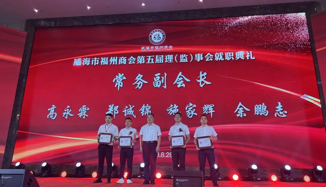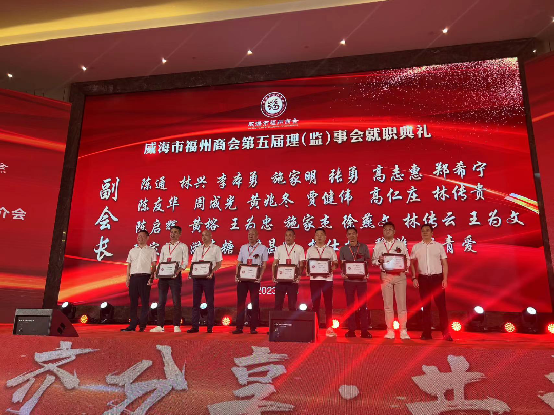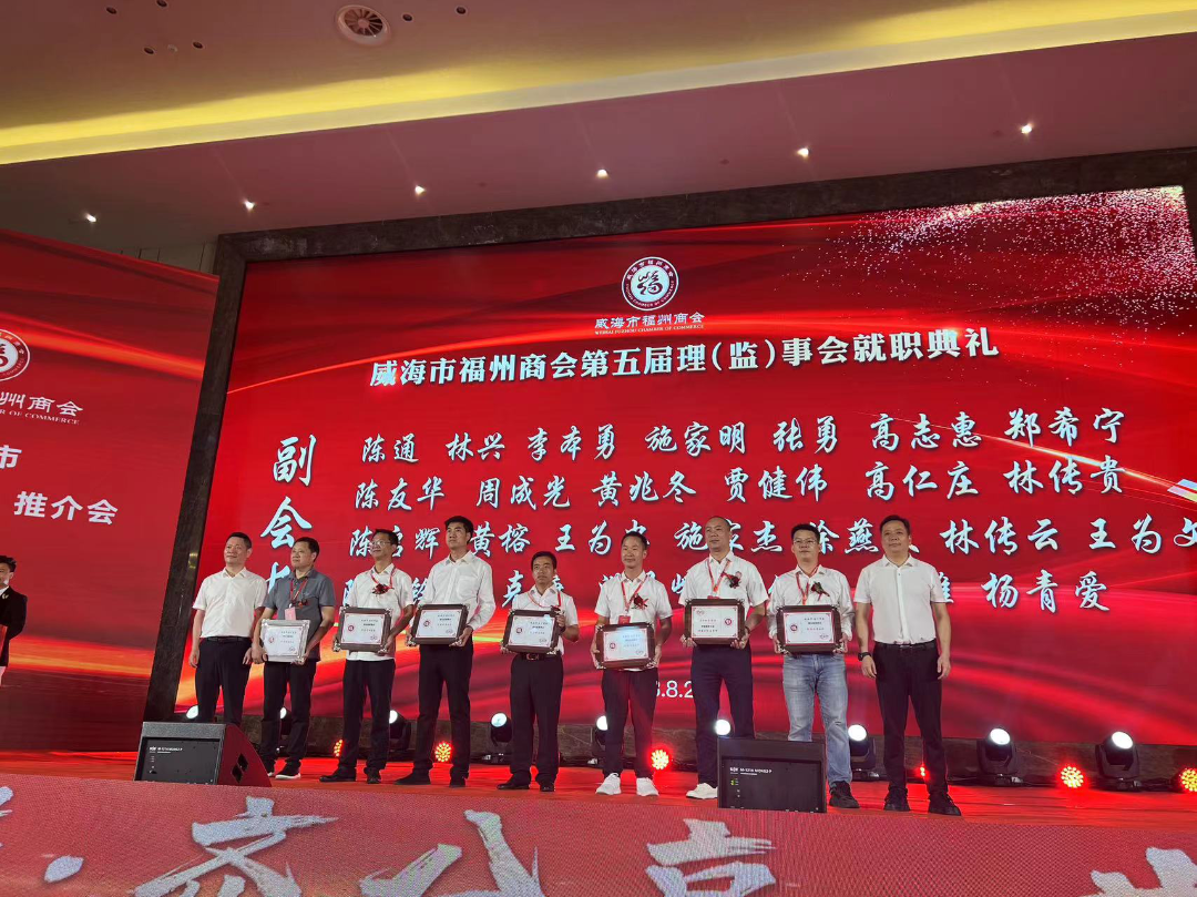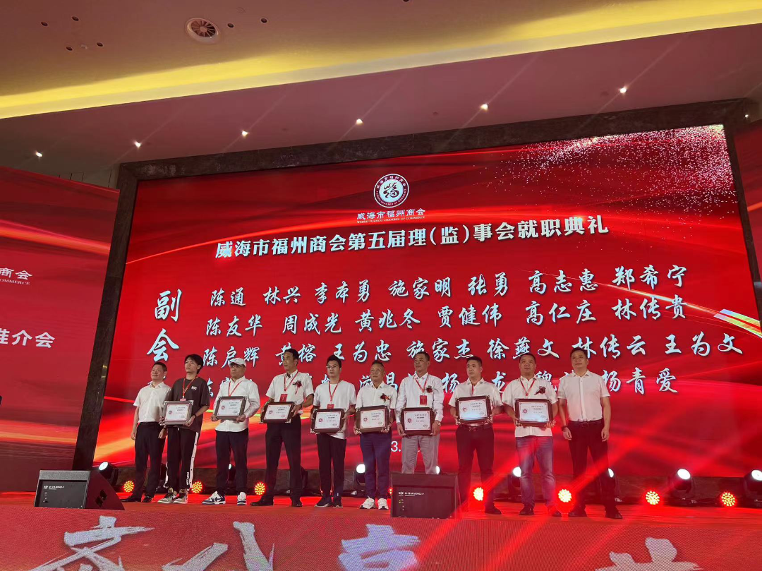 8月28日,威海市福州商会第五届理(监)事会就职典礼暨威海市“双招双引”推介会在华夏大酒店成功举办。福州市人民政府副市长林治良,威海市人民政府副市长邓勇,中共威海市委统战部副部长、市工商联党组书记、副主席徐其成出席活动并致辞。中共福州市委统战部副部长、市工商联党组书记陈锦,威海市民政局党组副书记、副局长苗家,威海市临港区党工委委员、管委会副主任丛涛,福州市海洋与渔业局副局长林海涛,福州市人民政府办公厅四级调研员林海,福州市远洋渔业发展促进会会长魏建生,福建省人民政府驻山东办事处主任陈道华等出席活动。省内外各地福州商会会长、党支部书记、副会长、秘书长及闽籍企业家,威海异地商会会长、党支部书记、秘书长等700余人参加活动。我会监事长翁武雄、常务副会长兼秘书长陈炜、办公室主任姜丽代表商会参加庆典。