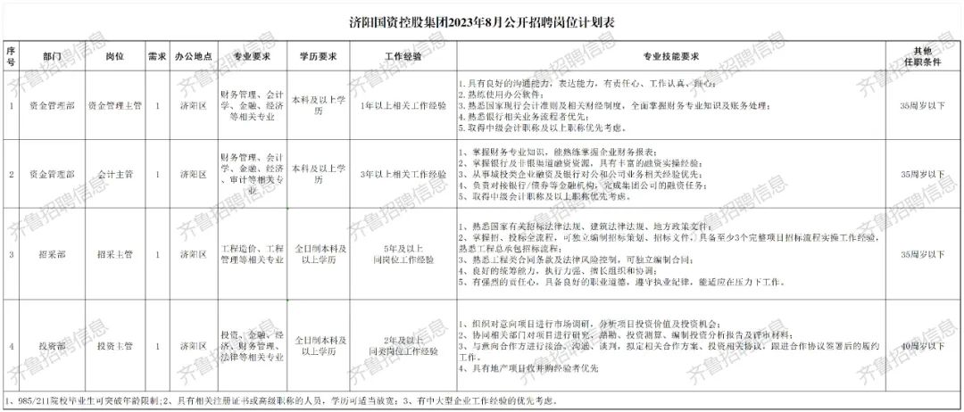 招聘岗位及条件详见附件1:《济阳国资控股集团2023年8月公开招聘岗位计划表》。