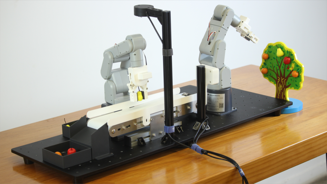 该场景为教科研级沙盘模拟应用,旨在通过传送带,协作机械臂,传感器模组为一套机器人的流水线在沙盘中作业模拟实际农业采摘分拣等场景,为教育科研开发、专业课程实训、实训室建设、机器人编程学习、农机应用开发等提供一款硬件丰富,开发便捷的应用案例和课程指导。