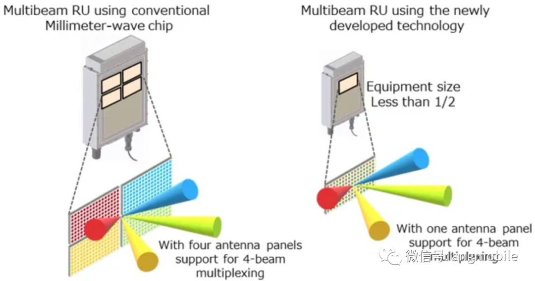 富士通公司称,现有传统技术采用单个毫米波芯片仅能产生单个波束,导致RU的体积较大,而且功耗增加;而富士通新开发出的毫米波芯片,用于基站毫米波无线电单元(RU)的单个毫米波芯片可以复用多达4个波束。5G公众号(ID:angmobile)了解到下图左(传统毫米波芯片),以4个天线面板支持四波束复用;下图右(富士通新开发的毫米波芯片),以1个天线面板支持四波束复用。
