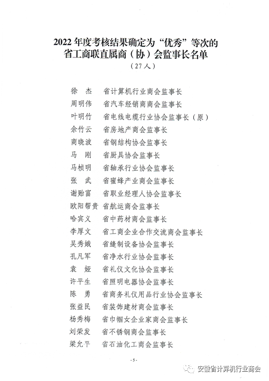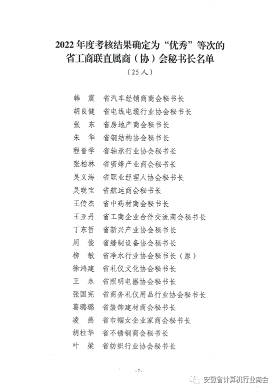 根据《关于印发〈安徽省工商联直属商(协)会会长、监事长、秘书长年度履职考核办法(试行)〉的通知》(皖联秘[2021]37号)要求,经各商会自评、省工商联各处室初评、会员处汇总评分、考核组会议审议,并经省工商联党组会议研究审定,确定省计算机行业商会等28家商(协)会会长、省计算机行业商会等27家商(协)会监事长、省汽车经销商商会等25家商(协)会秘书长2022年度考核结果为“优秀”等次。