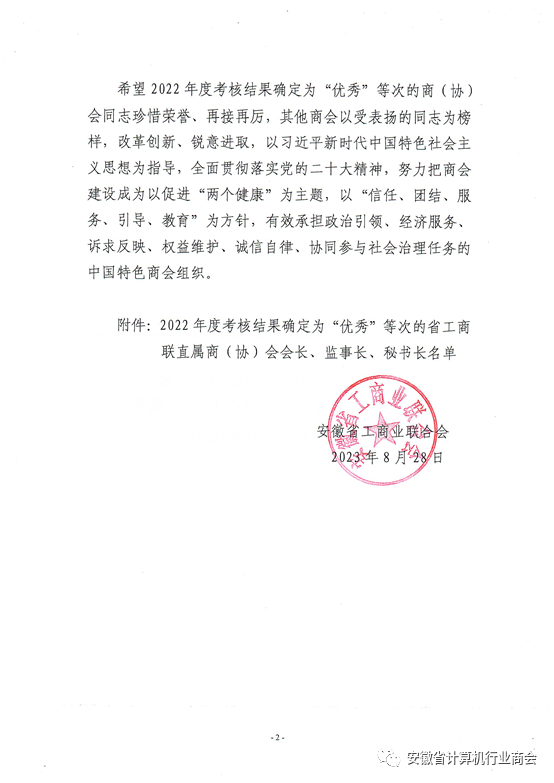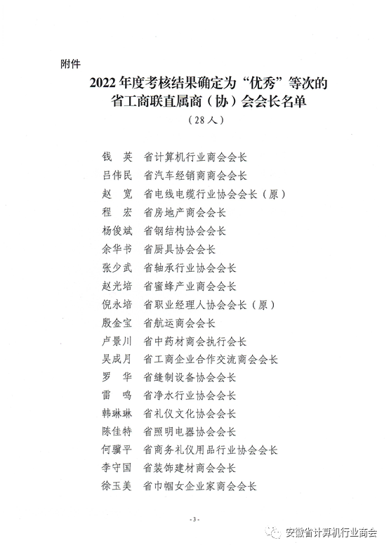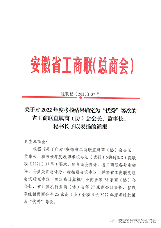 安徽省工商联(总商会)皖联秘[2023]37号文,对2022年度考核结果确定为“优秀”等次的省工商联直属商(协)会会长、监事长、秘书长予以表扬的通报,我会会长钱英、监事长徐杰名列其中。