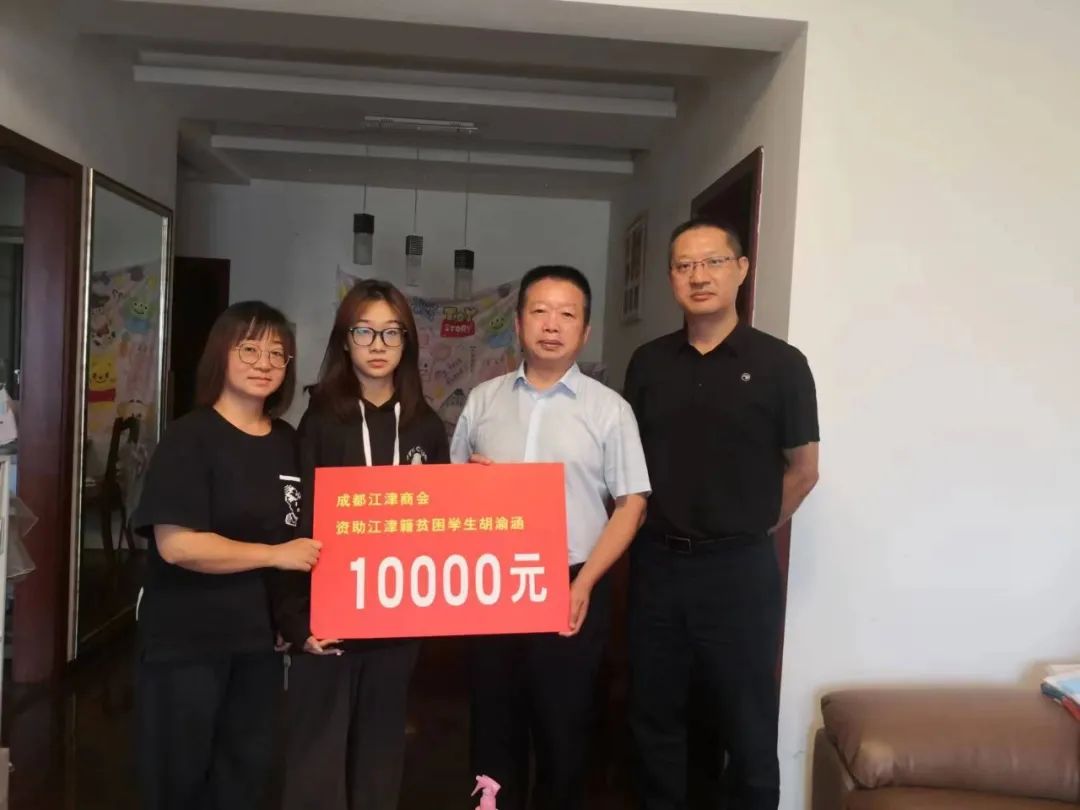 为积极履行社会责任,助力学子点燃希望,奋力迎接美好未来,2023年8月29日,经知情人、省委政法委领导陪同,商会党委书记、秘书长张志权和办公室主任张玲专程前往江津籍贫困学生胡渝涵家里看望慰问。经探访交流,详细了解了该学生家庭特殊困难,代表商会领导和全体会员向胡渝涵送上1万元爱心助学金,帮助她顺利进入大学追逐梦想,成就美好未来!