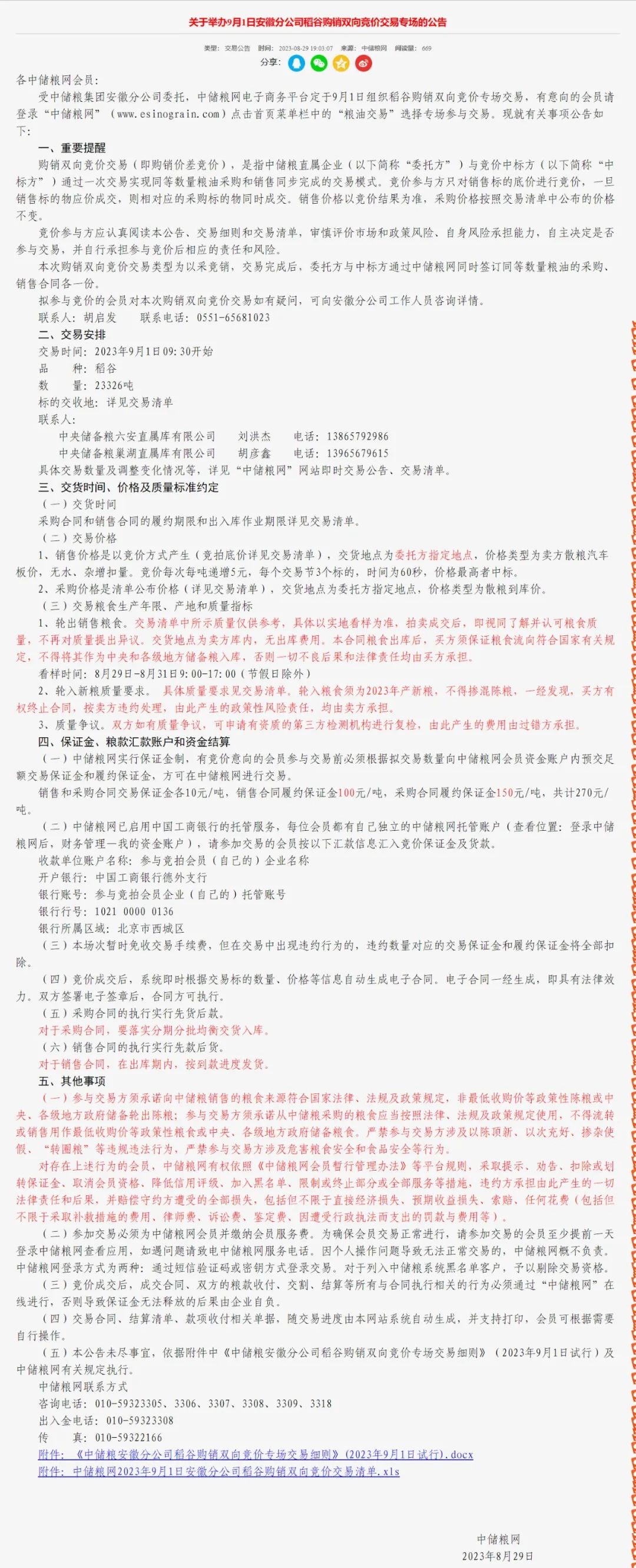 关于举办9月1日安徽分公司稻谷购销双向竞价交易专场的公告